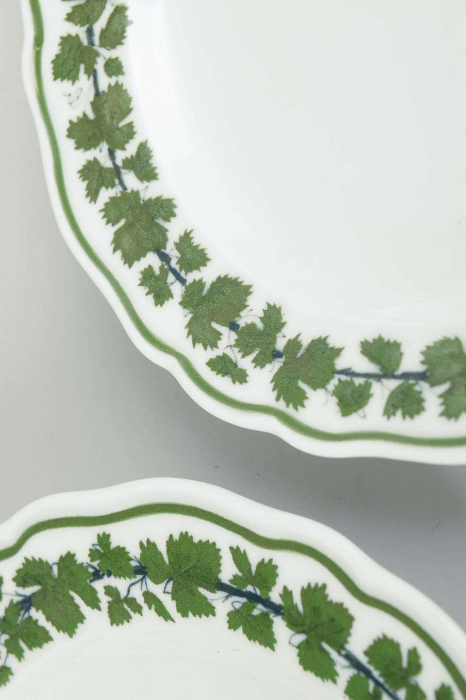 Meissen er Europas ældste porcelænsmanufaktur, grundlagt i 1710, og kendt for sit hårdporcelæn og håndmalede dekorationer. Serien med grønne vinranker og vinblade er et klassisk bordmotiv, hvor botanisk ornamentik kombineres med et rent og elegant formsprog.