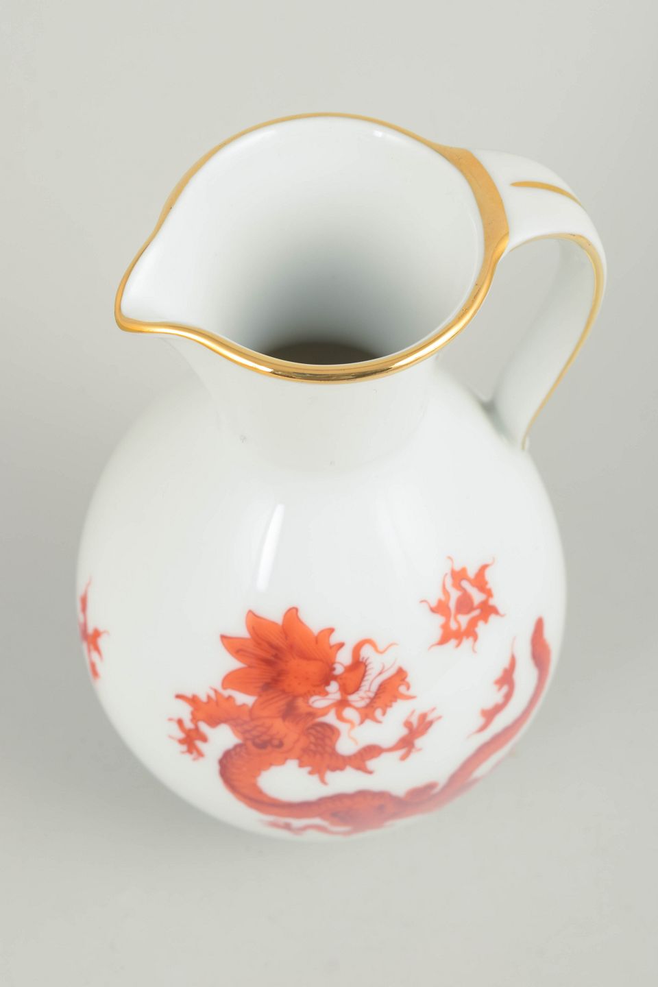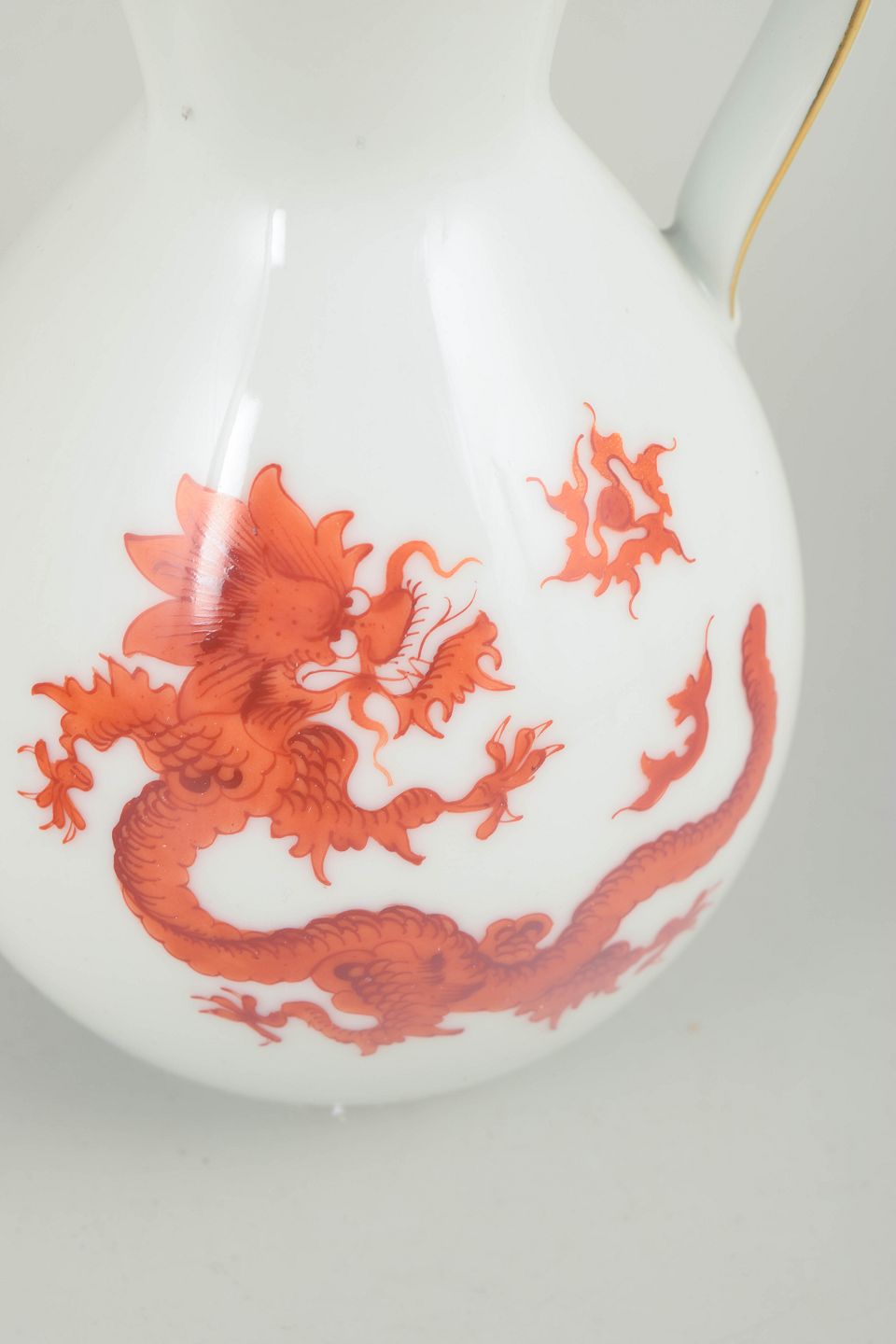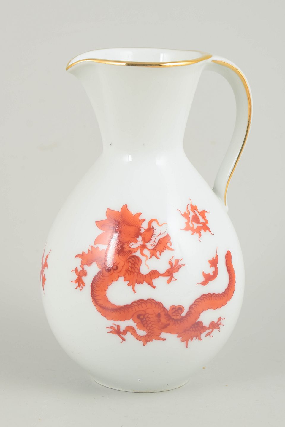 Kande med Mingdrage, Meissen-området.Balusterformet kande i hvidglaseret porcelæn dekoreret med rød Mingdrage og forgyldt kant. Modellen er fremstillet i Meissen-området og er ikke produceret af den kongelige Meissen-manufaktur.