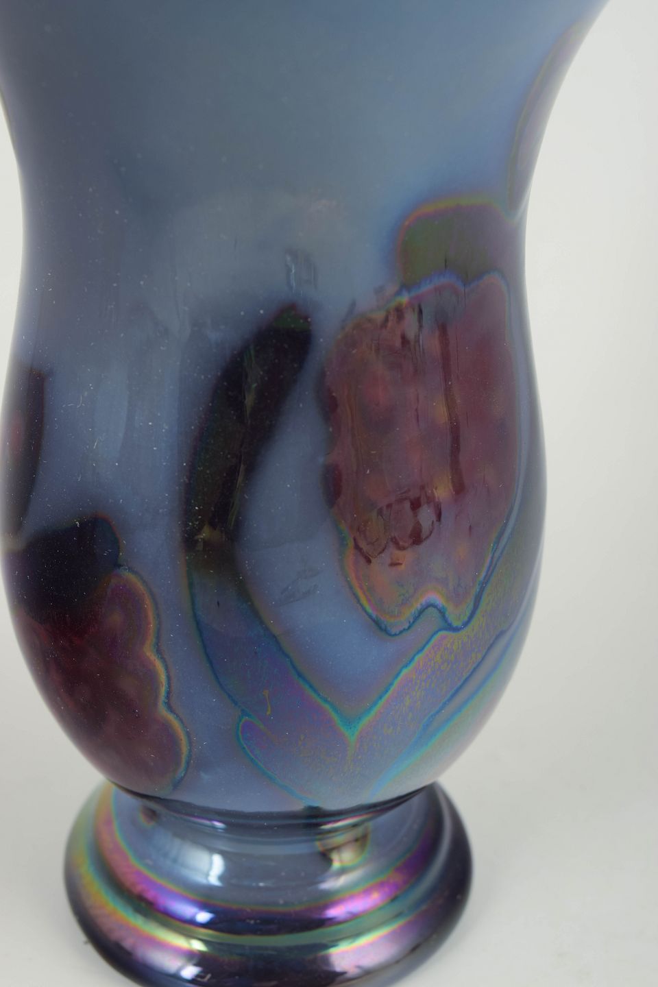 Dekorativ vase i glaseret keramik med blank luster-/metalglansglasur og abstrakte, iriserende farvespil i blå, violette og grønne toner.