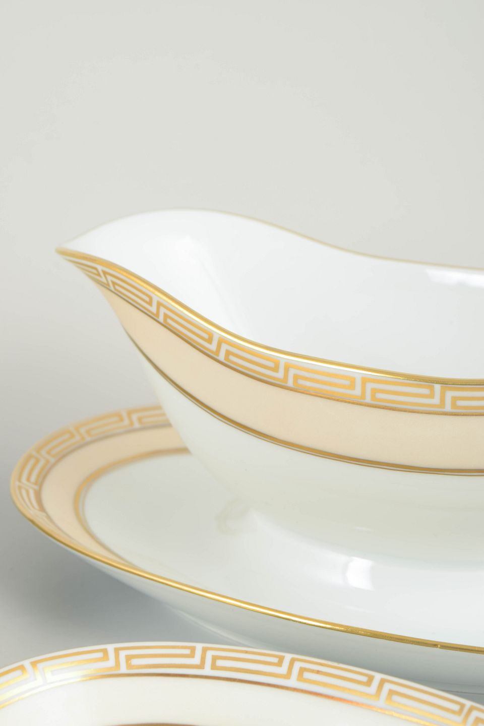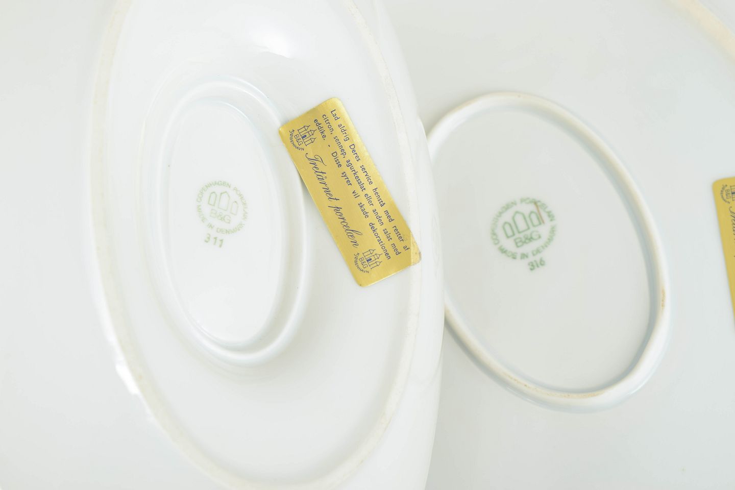 Bing & Grøndahl Rossini, sæt bestående af sovseskål, serveringsfad og lille fad.Sæt i hvidglaseret porcelæn med forgyldt kant og geometrisk bort i art deco-stil; modeller 317 og 316.