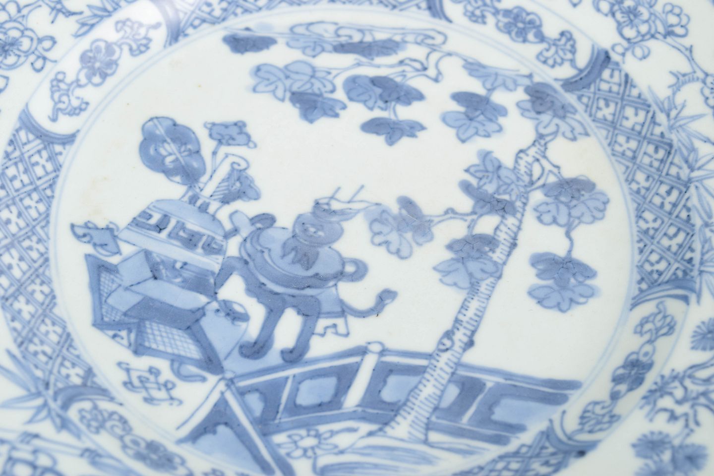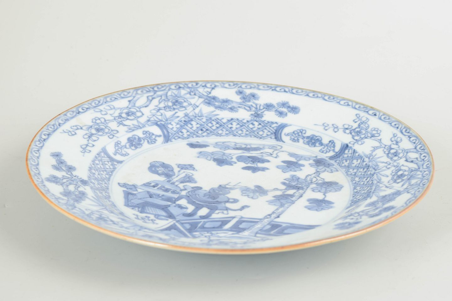 Kinesisk eksportporcelæn, tallerken.Rund tallerken i porcelæn dekoreret i underglasurblåt med orientalsk landskabsmotiv med figur, bro og blomstrende træer samt blomster- og ornamentbort langs randen.