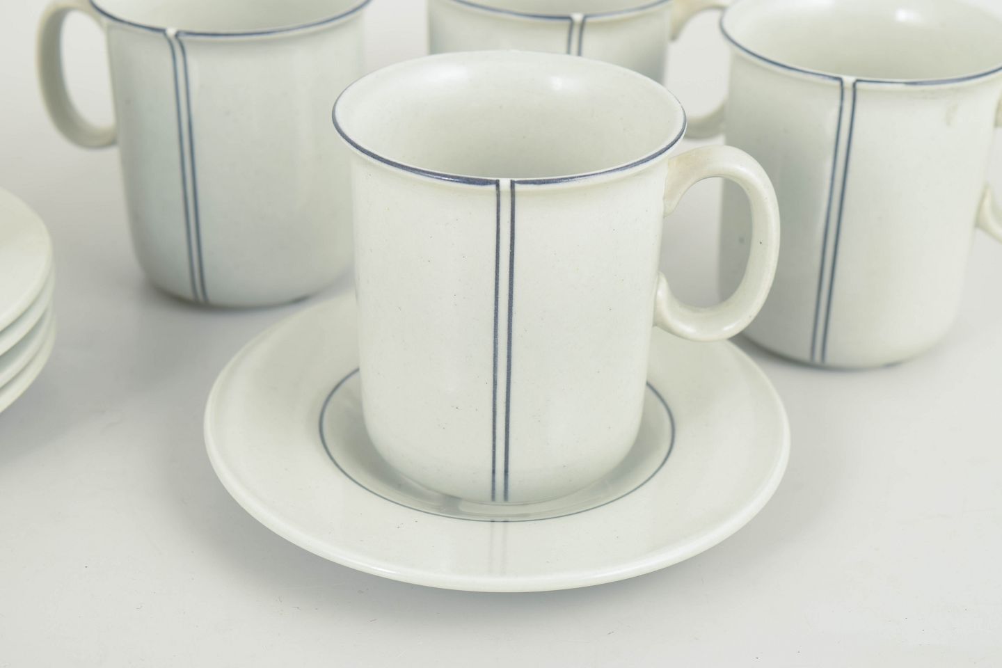 Enkle cylindriske kaffekopper i fajance med hvid glasur og diskret lodret blå stregdekor, udført i modellen “Demi”.