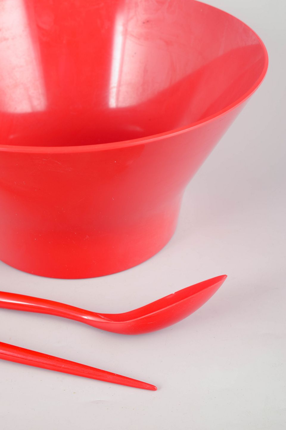 Henning Koppel for Torben Ørskov, salatskål med serveringsbestik.Organisk formet salatskål i rød plast med matchende serveringsske og -gaffel. Stemplet på undersiden “T. Ørskov & Co” samt H.K. Design Denmark”.