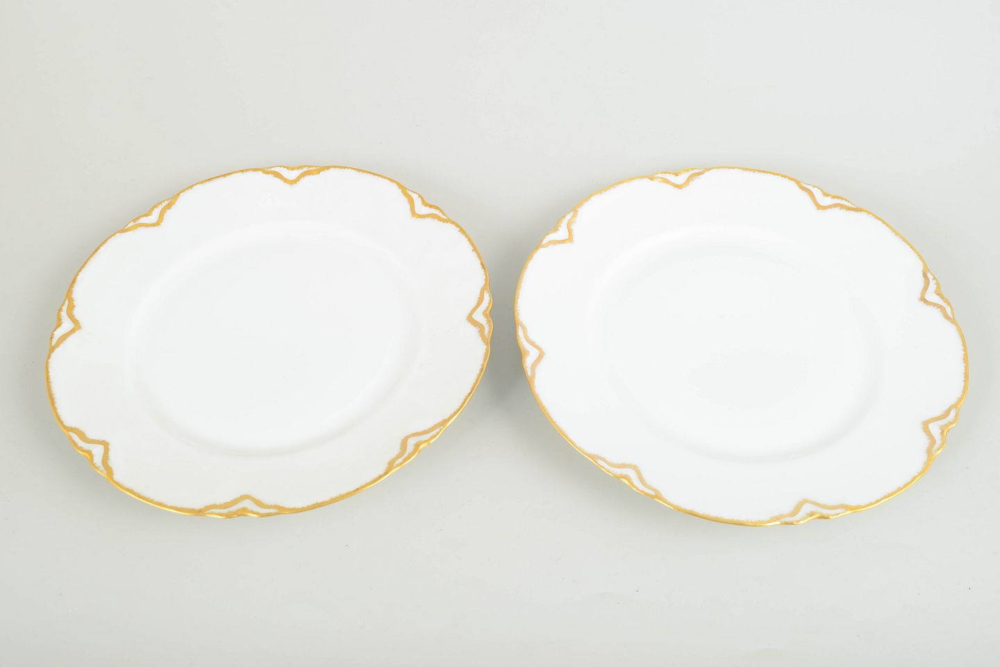 Haviland/Limoges, 2 middagstallerkener af porcelæn.To franske middagstallerkener i hvid fajance med bølget fane og dekoration i forgyldt kant samt stiliserede, Art Deco-inspirerede gulddetaljer langs randen.