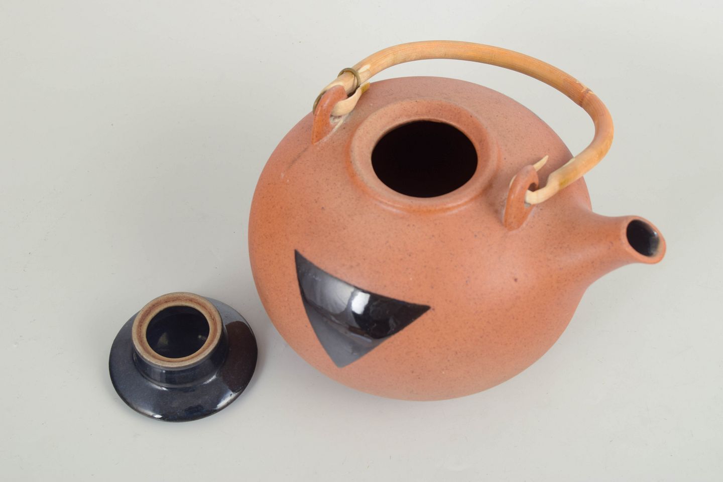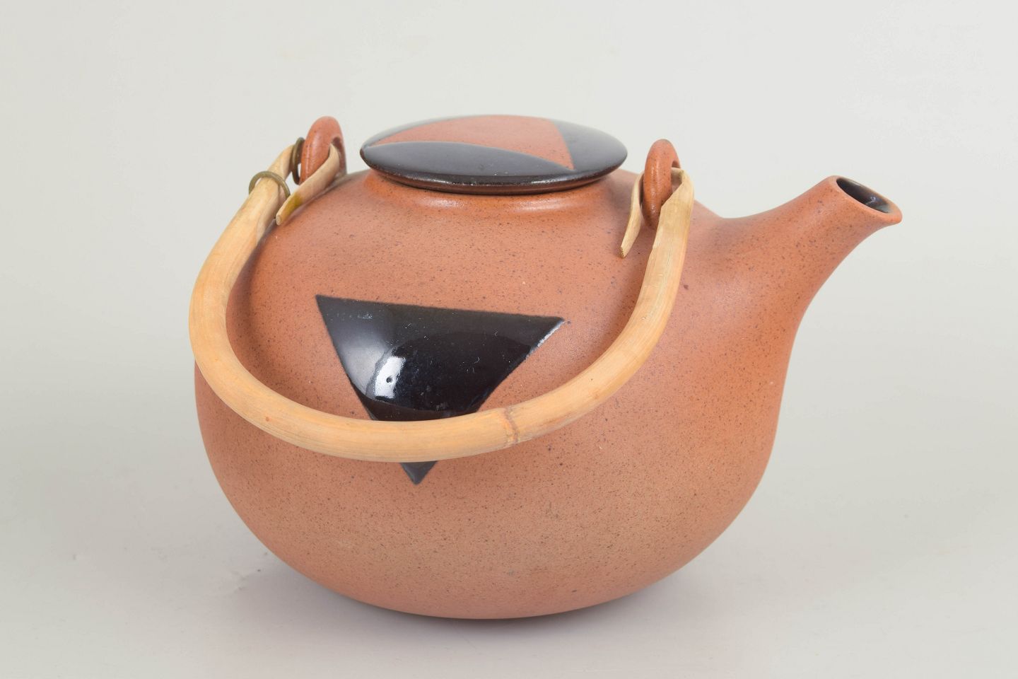 Inger Persson for Rörstrand, tepotte.Sjælden tepotte i stentøj med mat, varm orange/sandfarvet glasur og markant sort, trekantet dekoration på korpus. Udstyret med sort låg samt høj bøjlehank, som giver en skulpturel silhuet. Model 332.