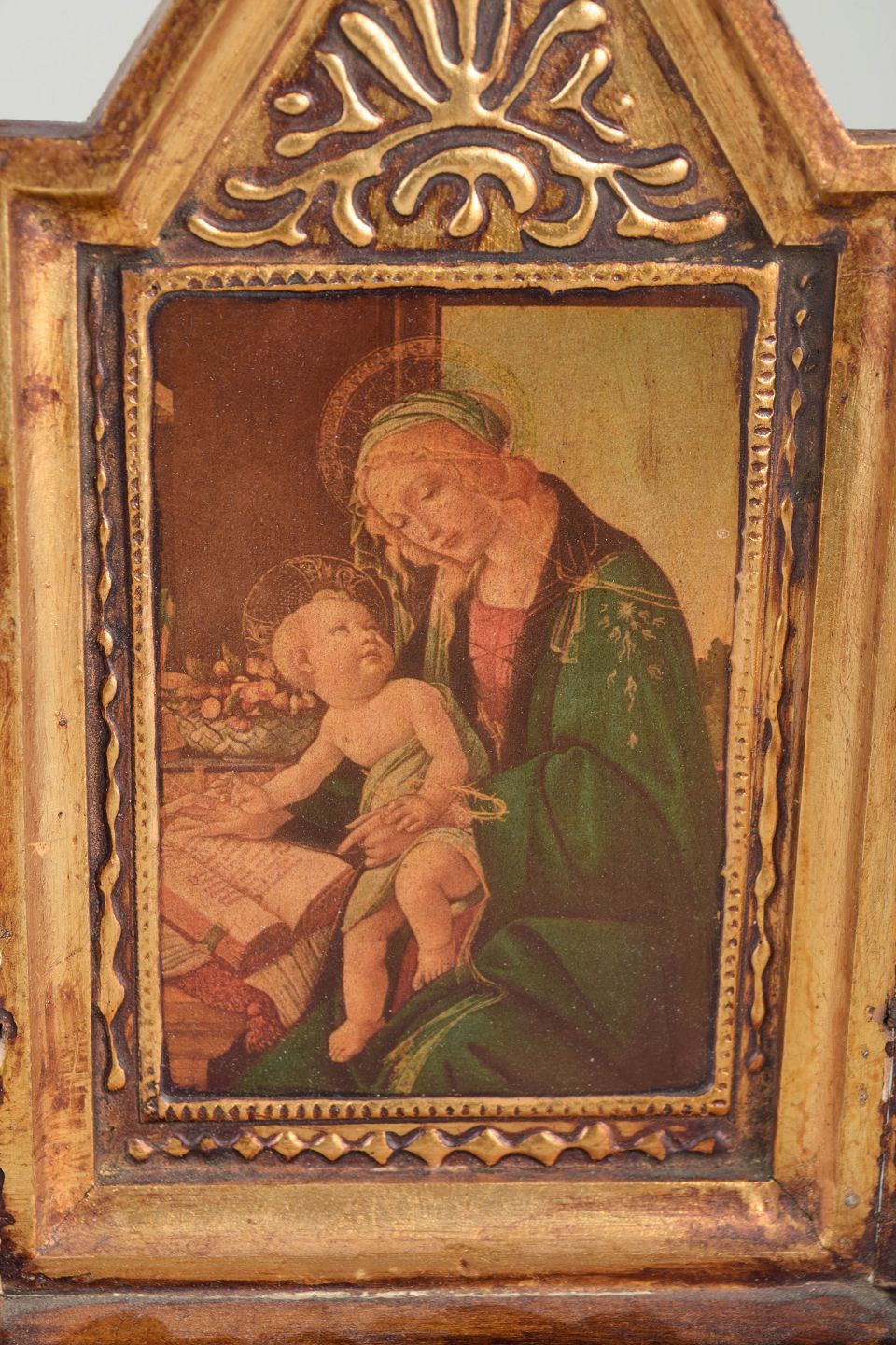 Antik russisk ikon-triptykon, 1800-tallet.Foldbart triptykon med centralt ikonmotiv af Madonna med Barn, flankeret af helgenfigurer på sidefløjene. Udført som maleri på træ med forgyldt og ornamenteret ramme.