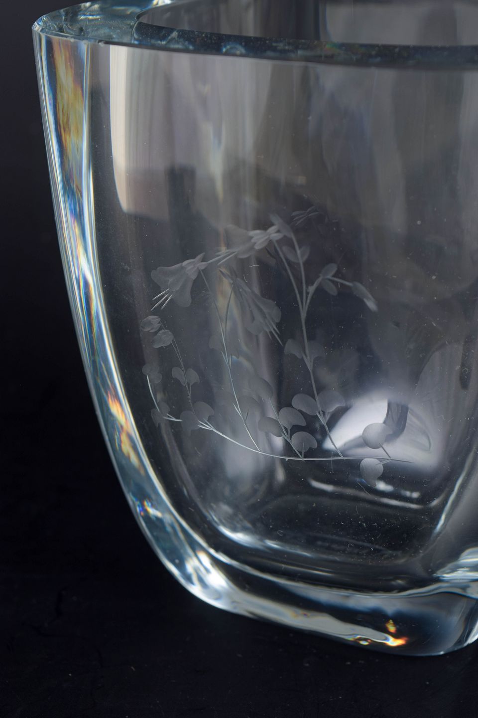 Svensk kunstglasvase, muligvis Orrefors.Kraftig, mundblæst glasvase med blødt afrundet, kvadratisk grundform og tyk, klar kant. Bærer en svagt ætset mærkning “KABI” i bunden.