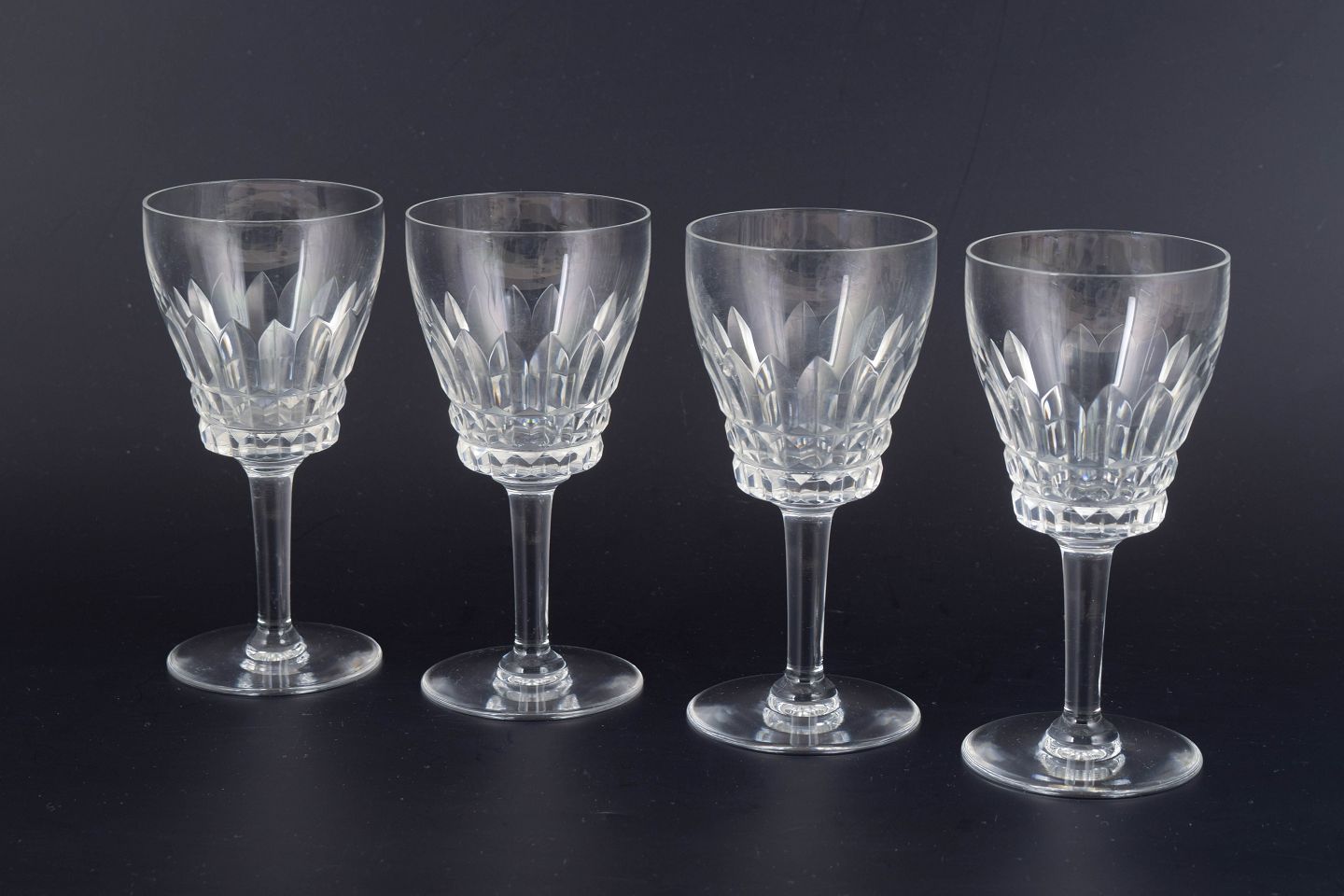 Fransk krystal, sæt på 4 hvidvinsglas.Sæt med fire franske hvidvinsglas i klart krystal med facetteret kumme og klassisk stamme. Form og slibning giver et elegant lysspil og et tidstypisk udtryk fra midten af det 20. århundrede.