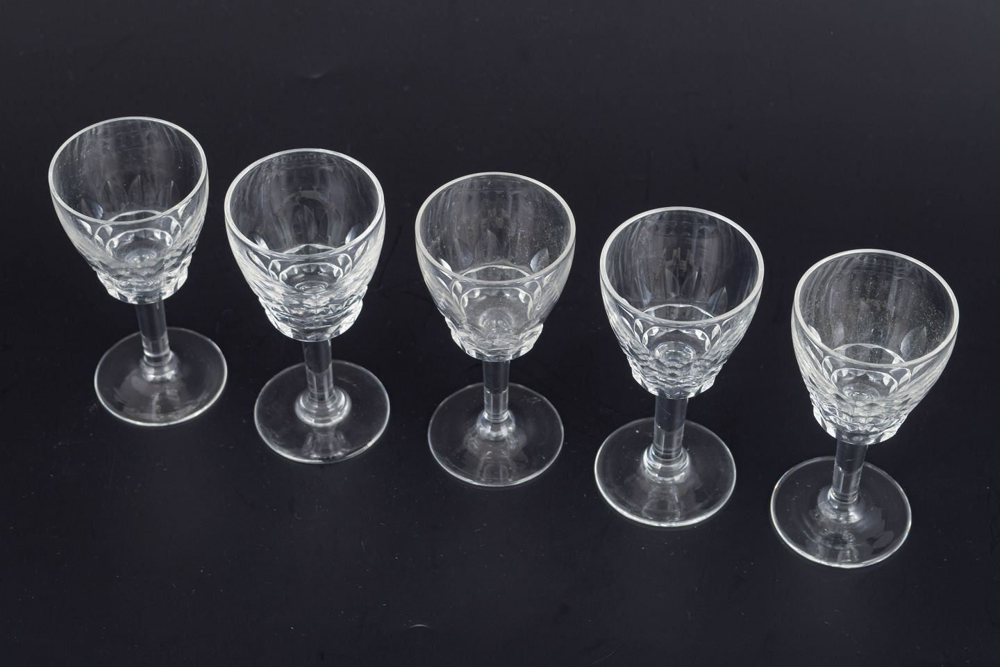 Franske krystalglas, sæt på 5 snapseglas.Sæt på fem franske snapseglas i klart krystal med facetteret kumme og klassisk stamme. Form og slibning giver et elegant lysspil og et tidstypisk udtryk fra midten af det 20. århundrede.