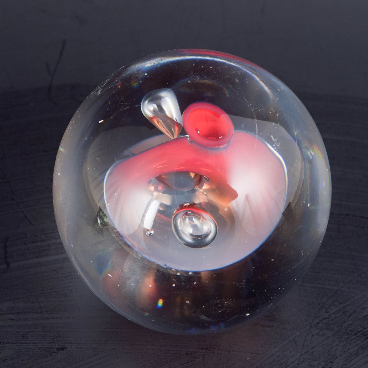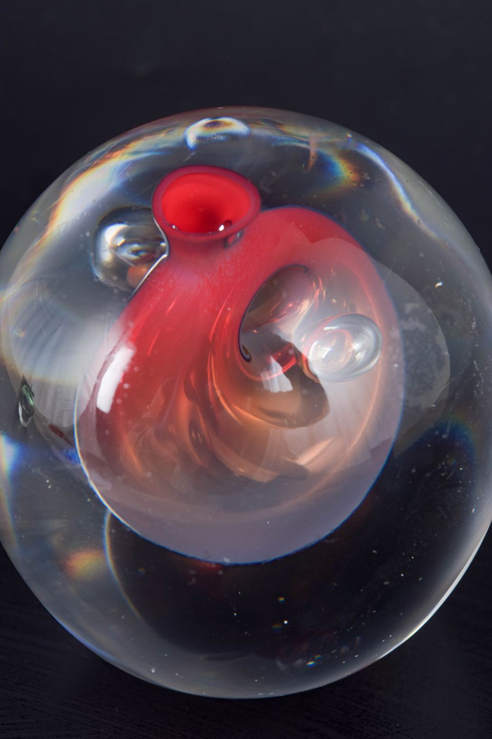 Studio Åhus, mundblæst glasobjekt.Skulpturelt glasobjekt i klart glas med indkapslet rød form og optisk “linse”-effekt i centrum, udført som mundblæst studioglas med fokus på volumen, lysbrydning og dybdevirkning.