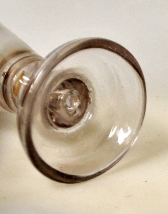 Frimurerglas. Conradsminde, 1834 - 1857, Danmark. Klart glas med bøjet fod og hul stilk. Dia.: 5,6 cm. H.: 12,5 cm.Emne nummer: 28837