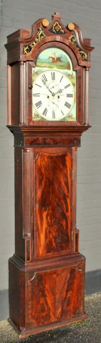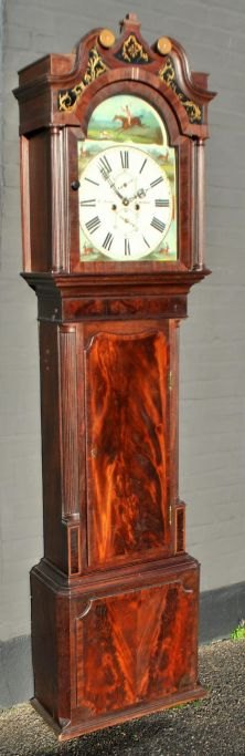 T. Airer, 18. årh. Liverpool, England: Louis XVI standur. Mahogni med kvartsøjler og svanetop. Bemalet urskive med jagtscene og dyr. Øverst bemalede glas. H.: 225 cm. B.: 55 cm. D.: 25 cm.Emne nummer: 28860