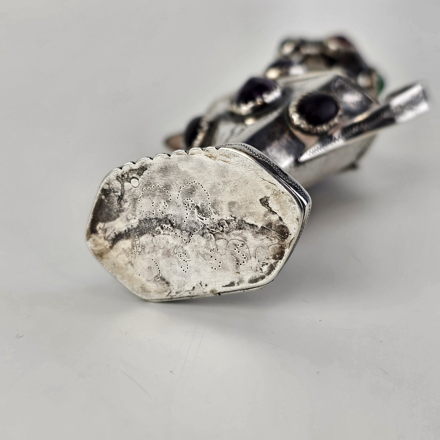 Hovedvandsæg i sølv dekoreret med forskellige smykkesten. Indgraveret under bunden med et hjerte, initialer og årstallet 1955Producent ukendt, stemplet muligvis CG
