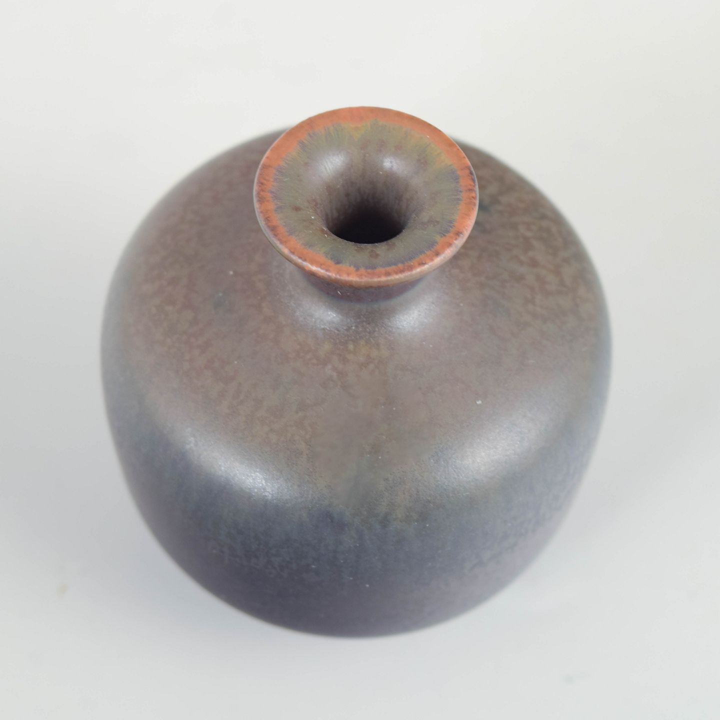 Gunnar Nylund for Rörstrand, miniaturevase.Kompakt miniaturevase i drejet stentøj med afrundet korpus og smal hals, udført med finspættet mat glasur i mørke gråbrune nuancer. Model 559, 1. sortering.