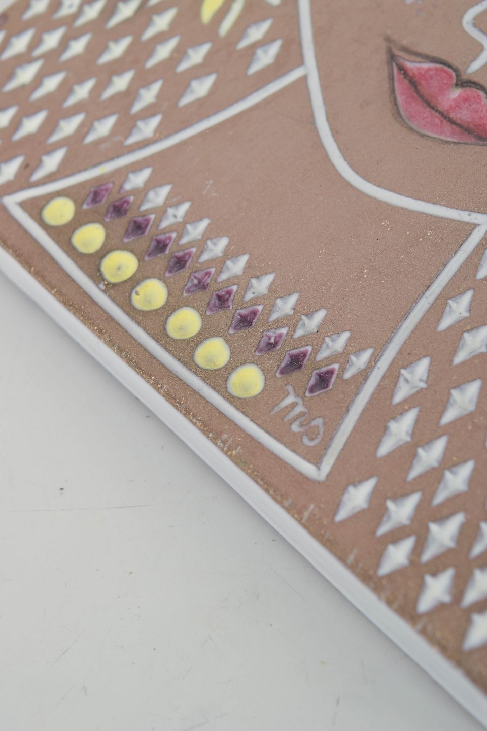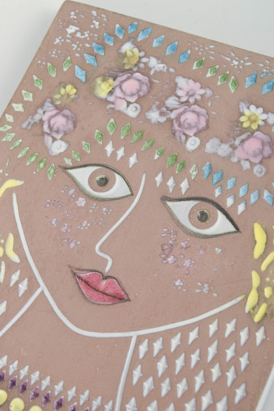Mari Simmulson for Upsala Ekeby, vægrelief.Rektangulært figurativt vægrelief model 5050 M med stiliseret kvindeportræt dekoreret med blomster og geometriske ornamenter i relief og farvet glasur.