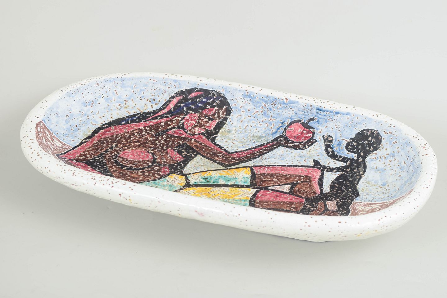 Erik Pløen, monumentalt unika vægrelief.Unikt figurativt vægrelief i glaseret stentøj med stiliseret mor- og barnemotiv udført i kraftige jordfarver og kontrasterende konturtegning.