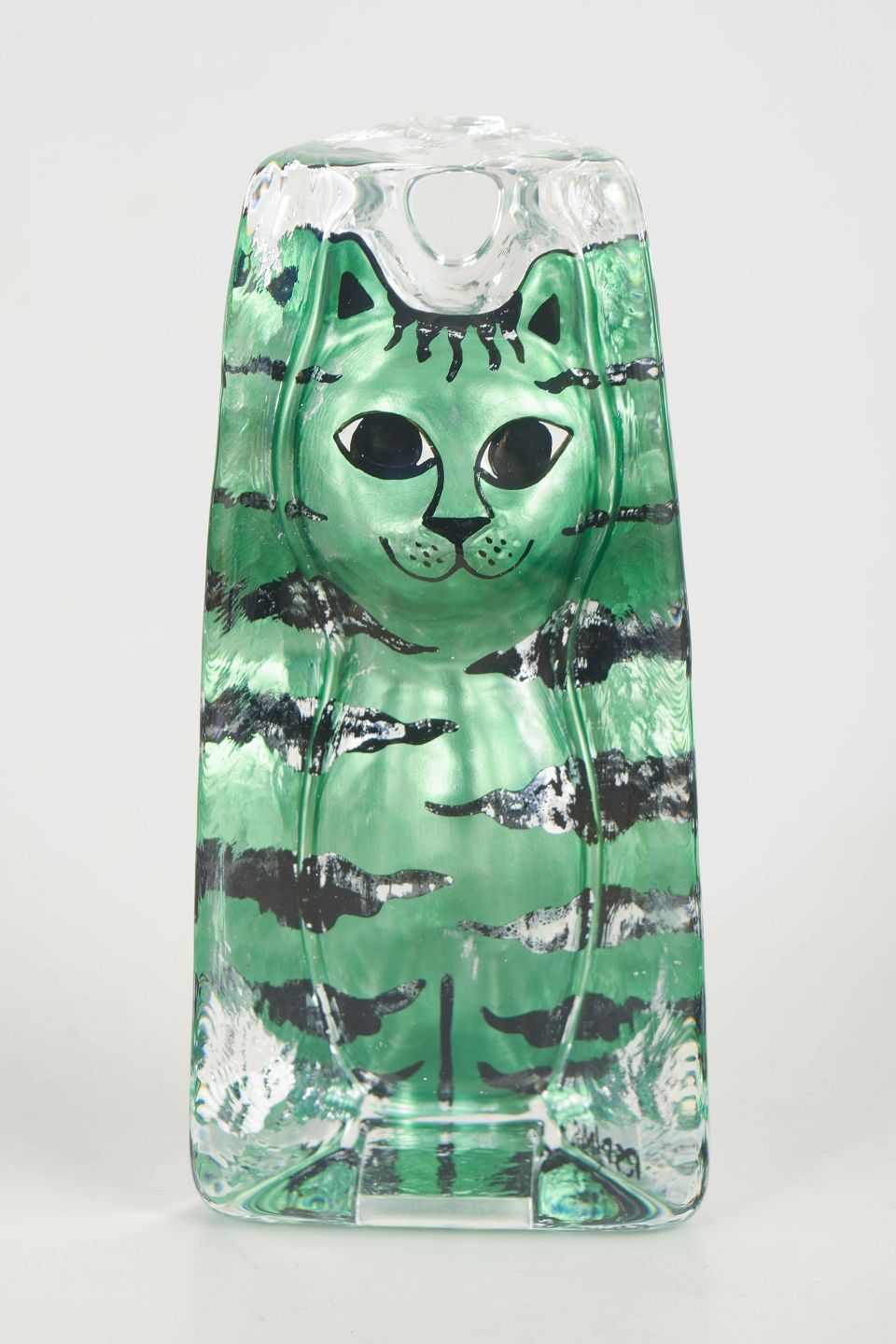 Renate Stock-Paulsson for Kosta Boda / Sea Glasbruk, kattefigur.Mundblæst glasfigur i klart glas med indkapslet grønt kattemotiv, håndmalede detaljer og model udført i reliefform inde i glasset.