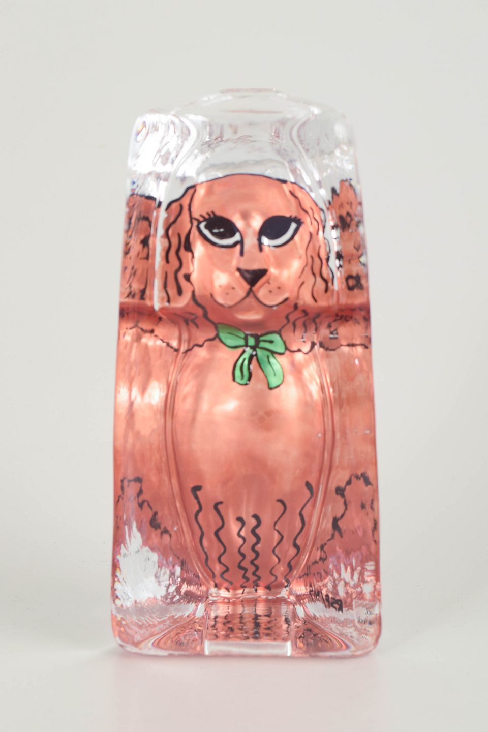 Renate Stock-Paulsson for Kosta Boda / Sea Glasbruk, hundefigur.Mundblæst glasfigur i klart glas med indkapslet rosa hundemotiv, håndmalede detaljer og model udført i reliefform inde i glasset.