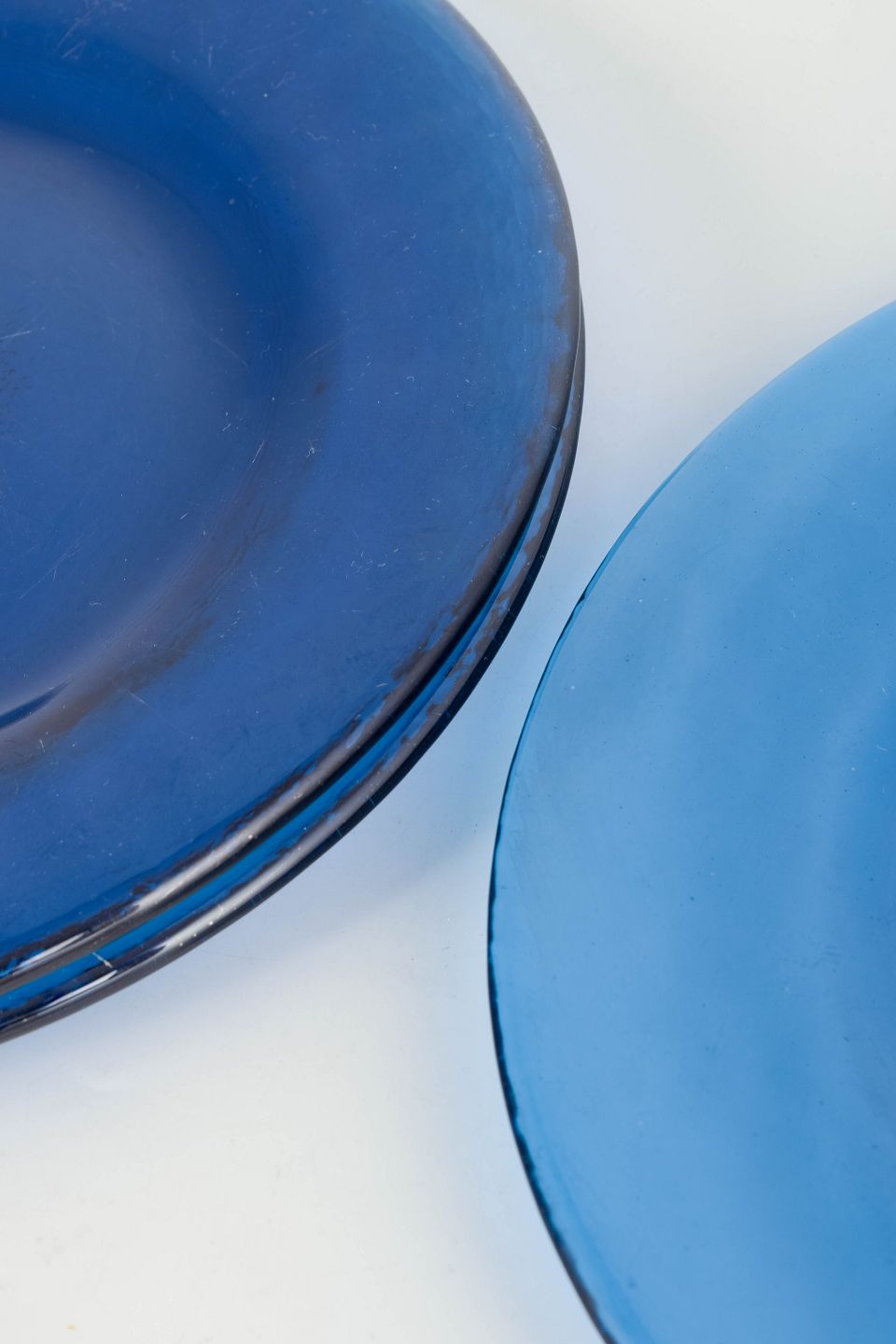 Svensk kunstglas, sæt med 3 tallerkener.Sæt med tre svenske tallerkener i kraftigt blæst kunstglas i blå nuancer, udført med glat spejl og let ujævn rand, typisk for skandinavisk glasdesign fra midten af det 20. århundrede.