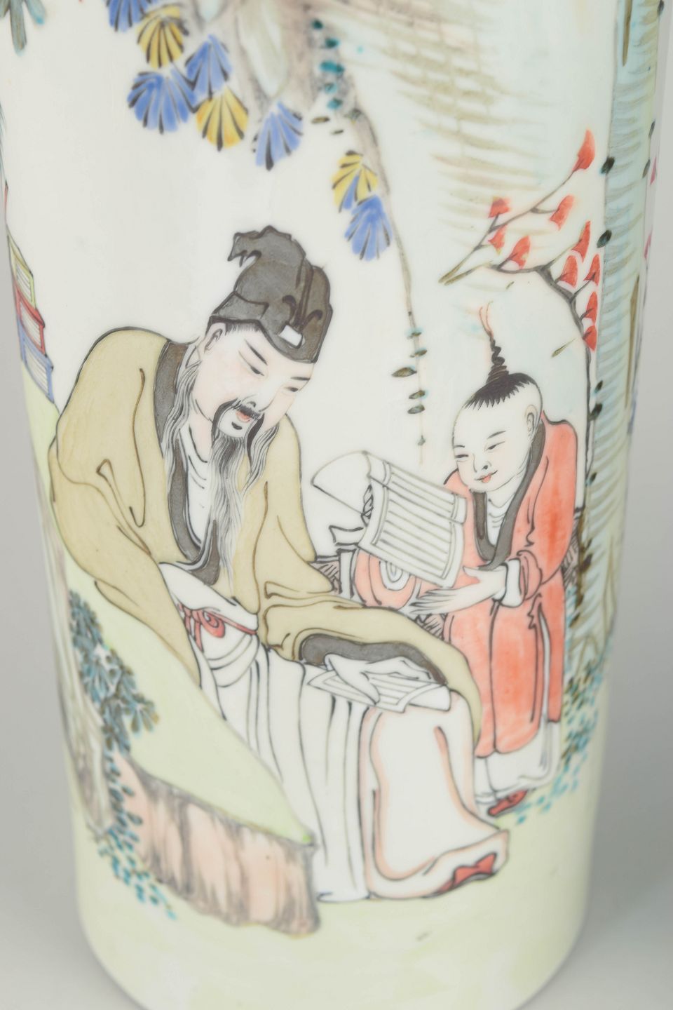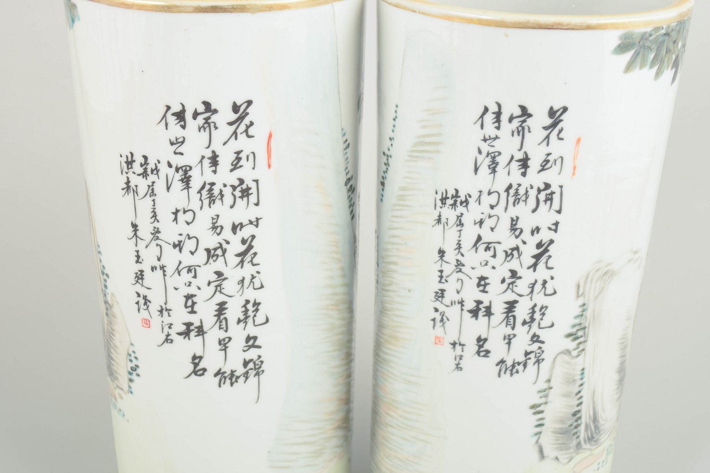 Kinesisk porcelæn, par vaser .Par cylindriske vaser i porcelæn, hånddekoreret med figurscener i emaljefarver samt kalligrafi og segl. Den kalligrafiske tekst kan oversættes til: “Blomsternes duft er ren og vidtrækkende; de elegante blomster afspejler en forfinet smag og udtrykker ro, harmoni og samklang mellem natur og menneske.”