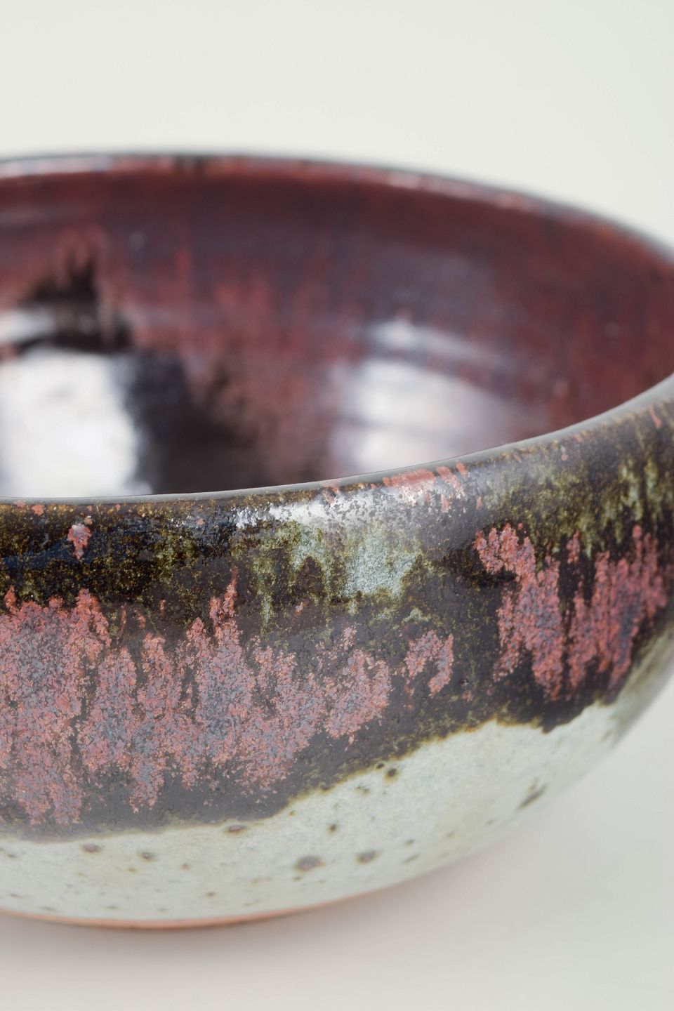 Helle Allpass, unika skål.Unik, drejet skål i stentøj med kraftig, løbende glasur i dybe bordeauxrøde og mørke toner over lys bund, udført som et enkeltstående studiearbejde.