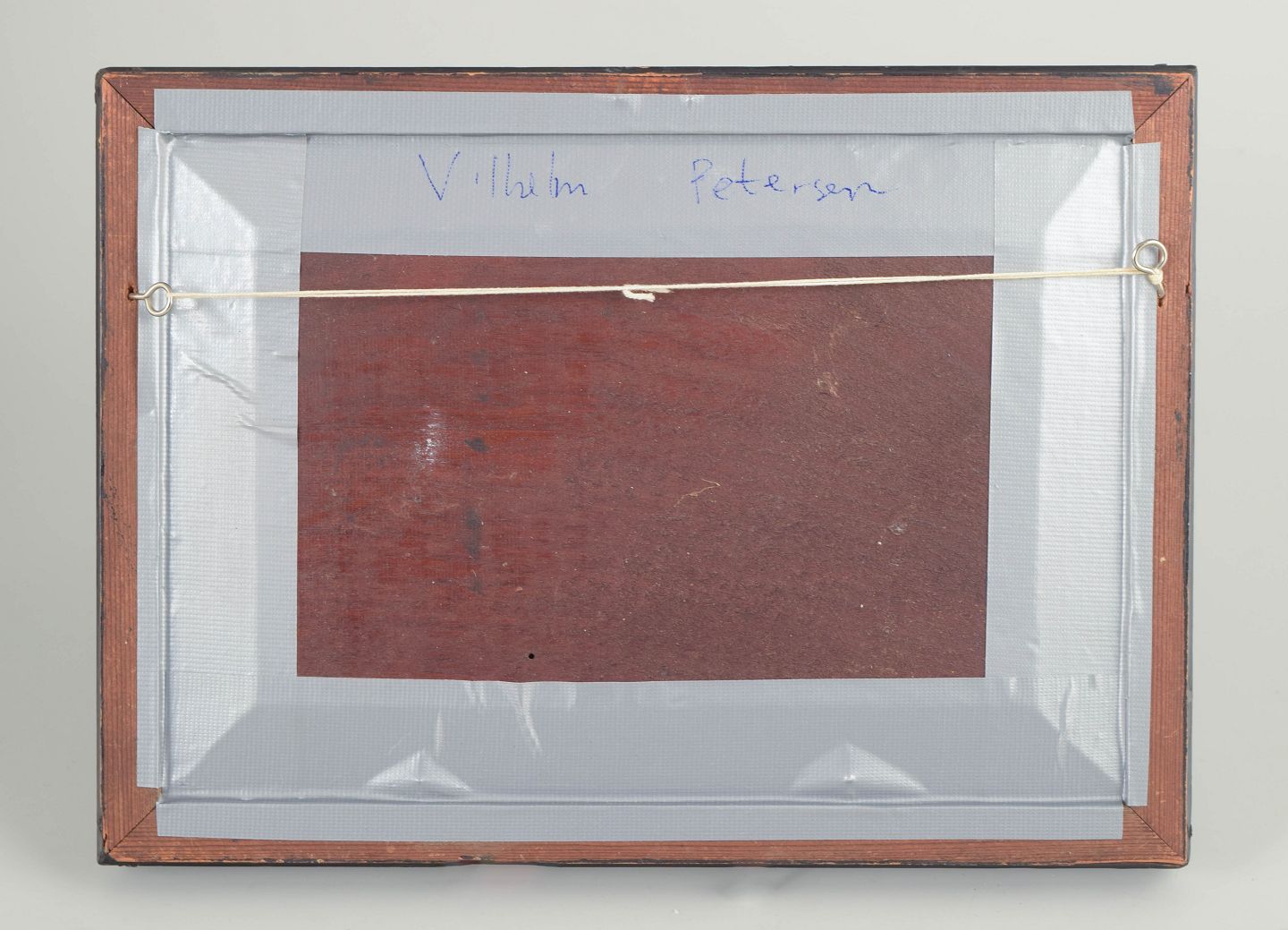 Vilhelm Petersen, oliemaleri på mahogni, dansk guldaldermaler.Landskabeligt motiv med bindingsværkshus og snoet vej i et åbent, idyllisk landskab udført i olie på mahogniplade, usigneret.