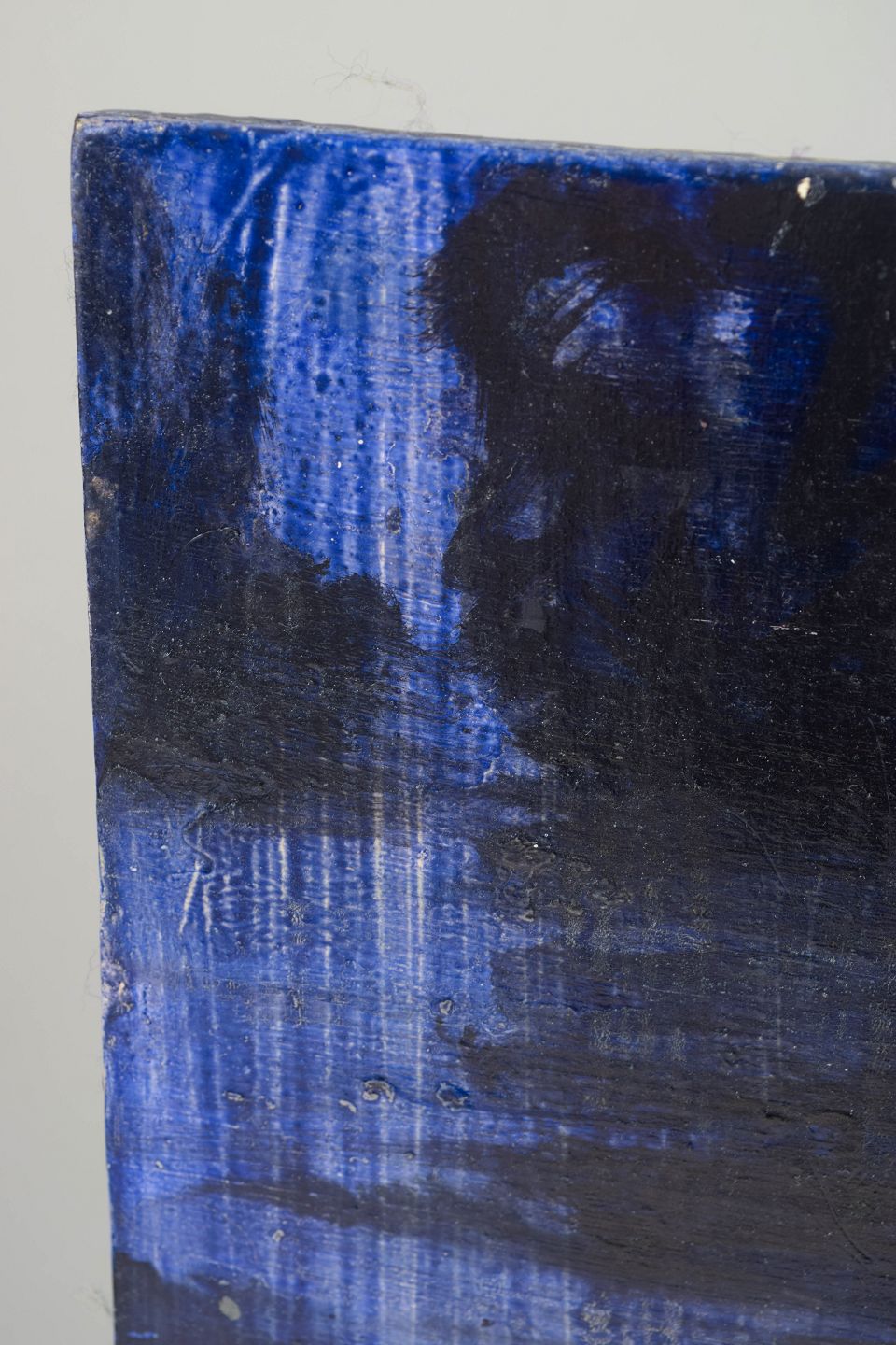 Abstrakt og stemningsfuldt motiv med horisontale, spejlende farvefelter i blå og mørke toner, udført i olie på plade. Signeret og med titelangivelse “Vattenspeglingar” på bagsiden.