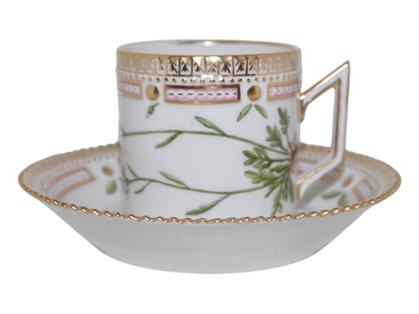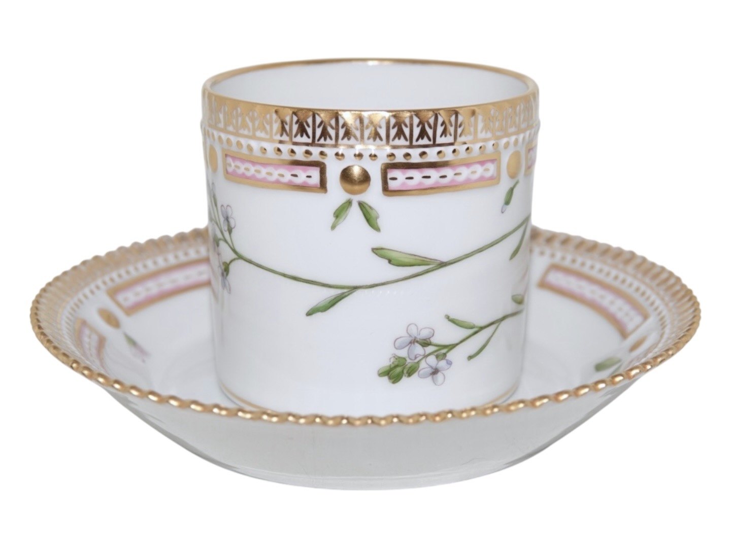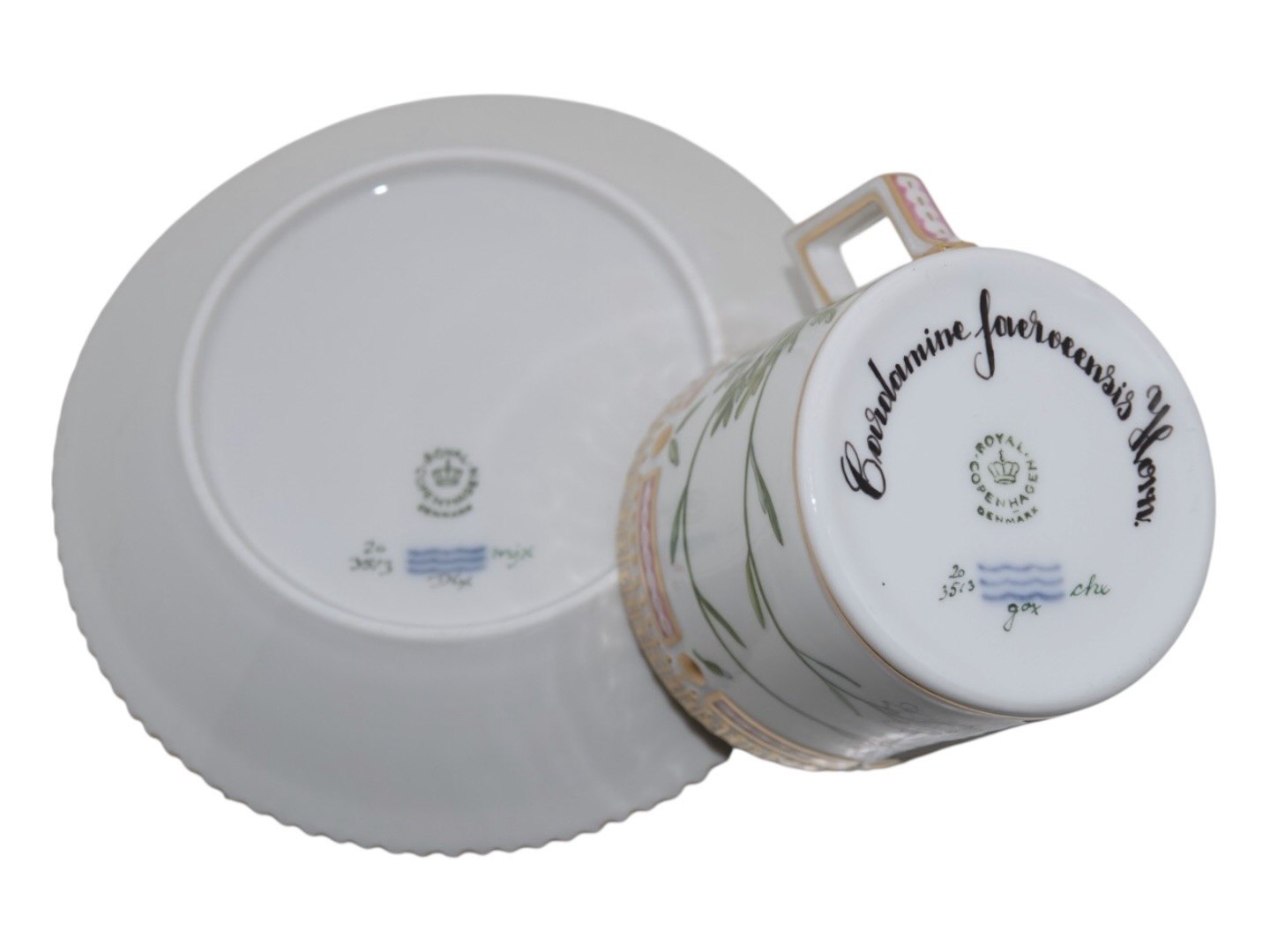 Royal Copenhagen Flora Danica, chokoladekop med tilhørende underkop.Dekoreret med blomst "Cardamine faeroeensis Horn", som er "Færøsk Engkarse" på dansk.