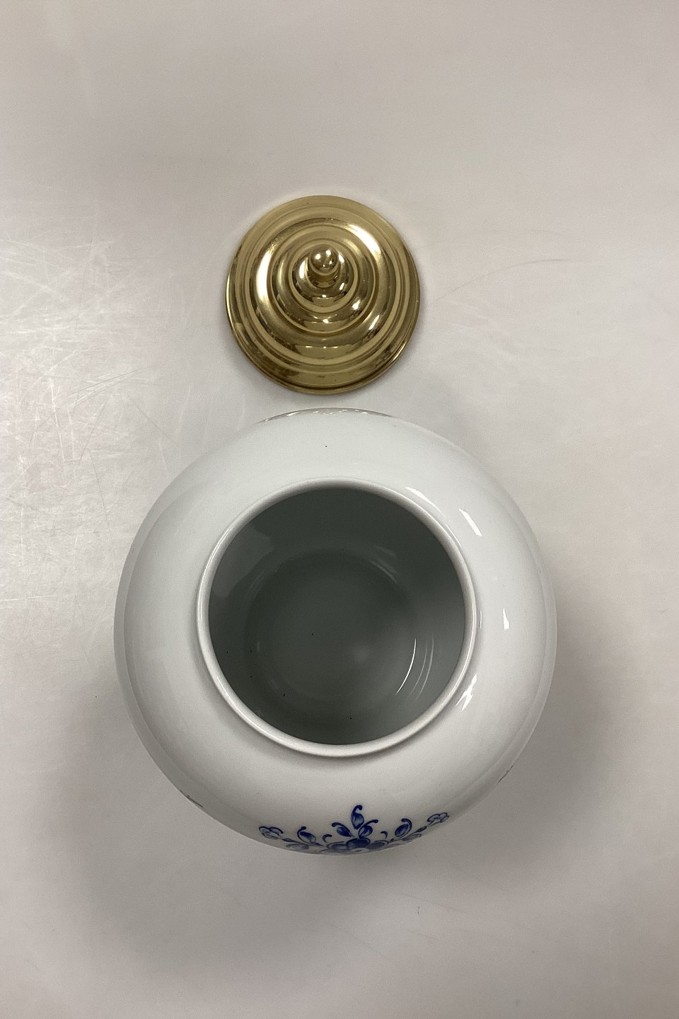 Bing og Grøndahl Tobakskrukke - Tabac No.6055/7148. Fremstillet i anledning af Skandinavisk Tobakskompagnis 25-års Jubilæum (1961-1986). Porcelæn med messinglåg. Logo på bagsiden: 1961 ST 1986.Måler 25 cm / 9,84 in. med låg.
