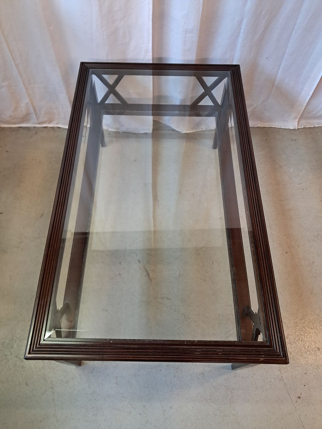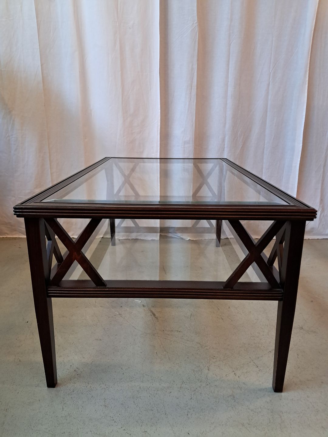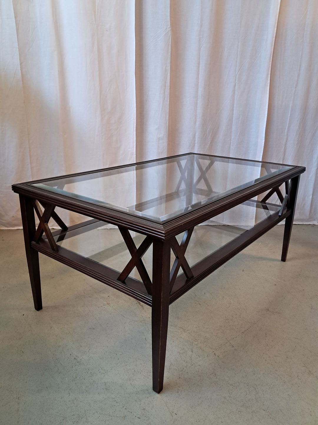 Sofabord i fineret mahogni med 2 glasplader, fra 2000erne.Det har brugsspor.
