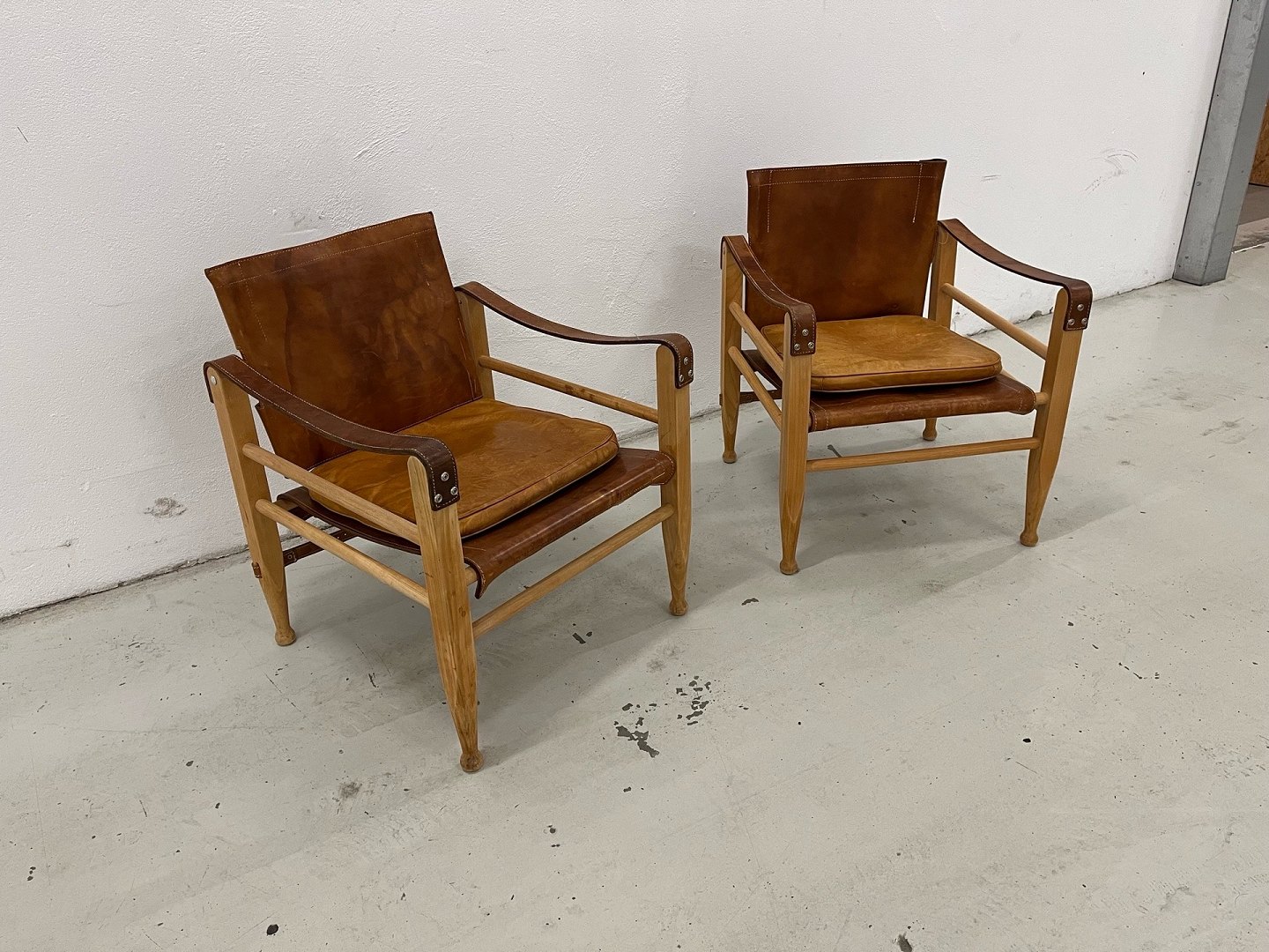 Et helt unikt og særdeles velbevaret sæt safaristole designet af Aage Bruun & Søn fra 1960’erne. Stolene er udført med stel i massivt bøgetræ samt sæde, ryg og armlæn i cognacfarvet, patineret kernelæder. Læderet fremstår smukt patineret, og både spænder, stropper og stel er i fuldstændig original og fejlfri stand.