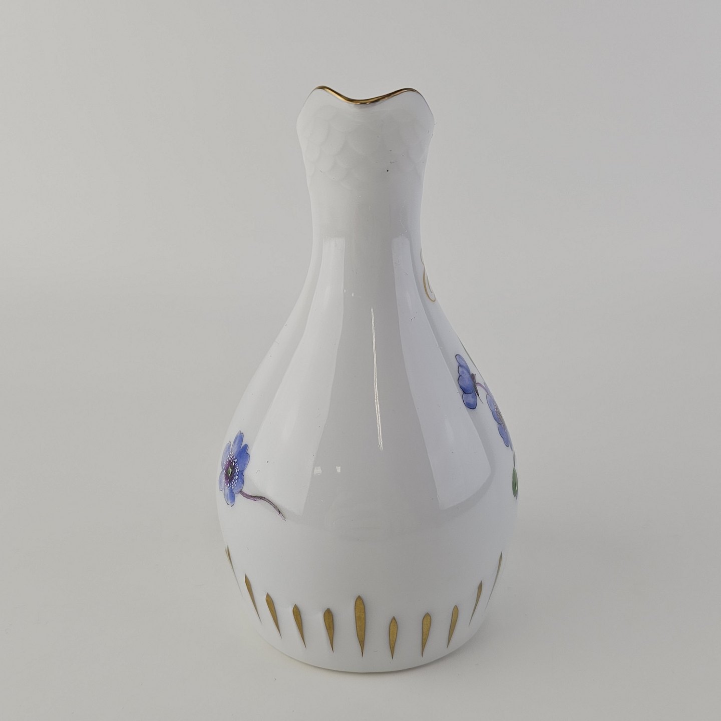 Antonius er af hvidt porcelæn med skælform dekoreret med håndmalede blå anemoner og guldkant. Også kendt under navnet Blå Anemone.