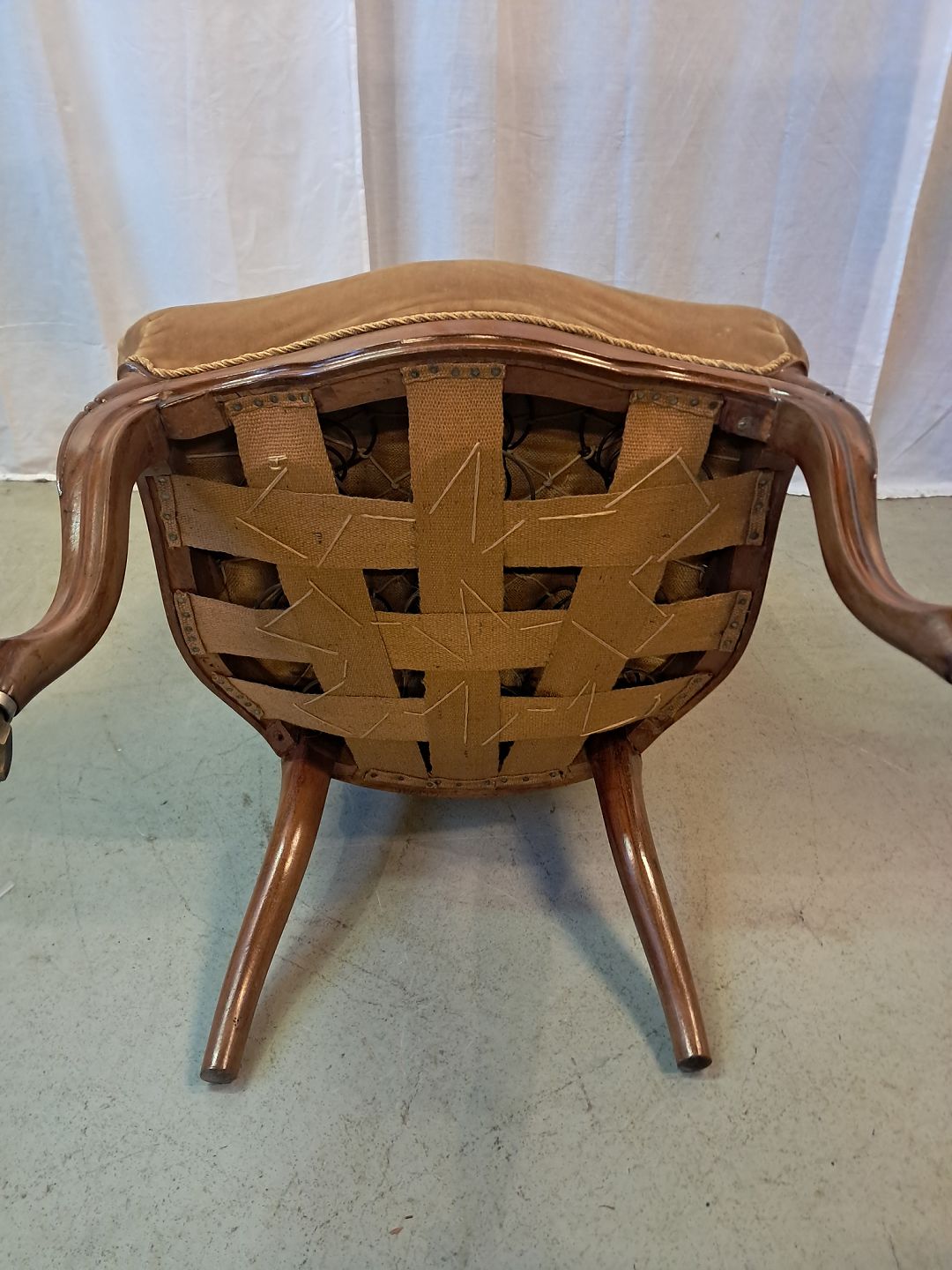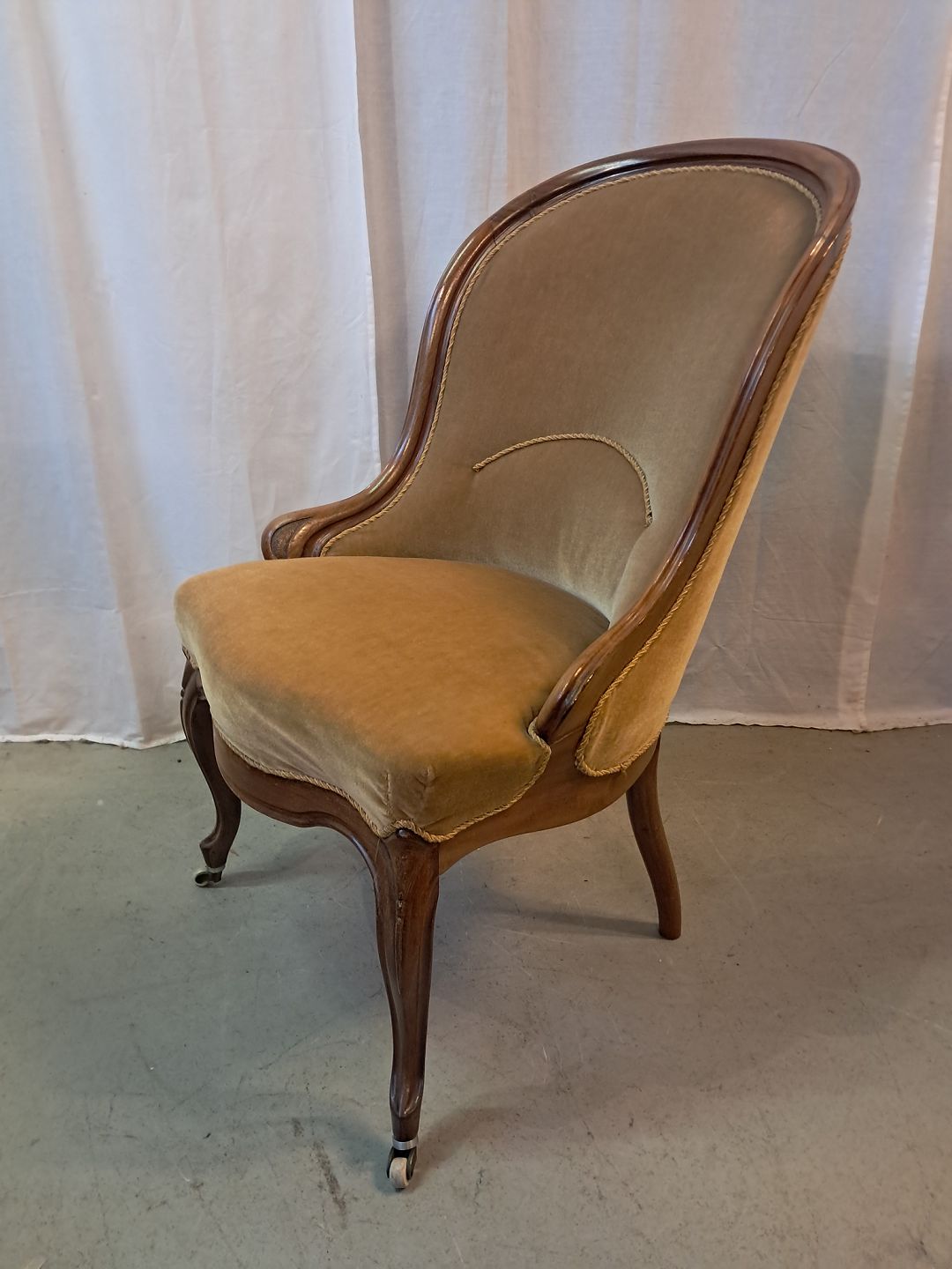 Lænestol i mahogni med velour betræk, fra 1900erne.Den har små brugsspor.