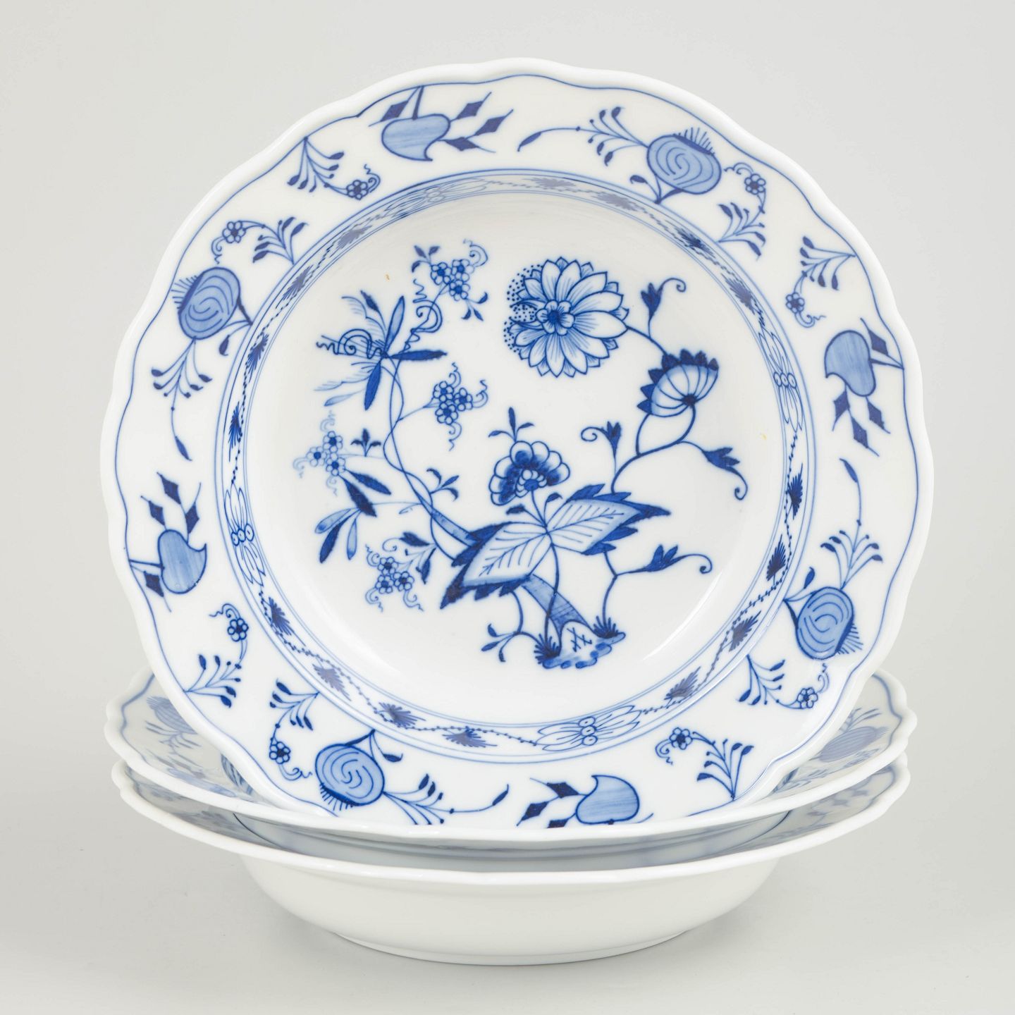 Meissen, løgmønster, dybe tallerkener, sæt på 3.Dybe tallerkener i hvidt porcelæn dekoreret i underglasurblåt løgmønster med bølget fane. Mærket i bunden med Meissens krydsede sværd.