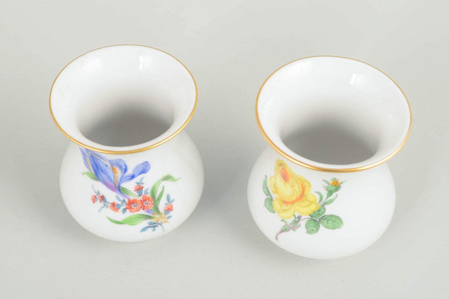 Meissen, miniaturevaser, par.Små balusterformede miniaturevaser i hvidt porcelæn, dekoreret med håndmalede polykrome blomsterbuketter og afsluttet med forgyldt rand. Mærket i bunden med Meissens krydsede sværd.