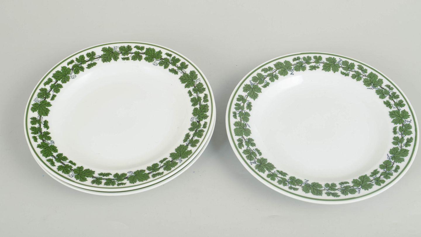 Meissen, Vinløv, sæt på 3 tallerkener.Runde porcelænstallerkener dekoreret med grøn vinløvsbort langs kanten. Første sortering, mærket med Meissen krydsede sværd.