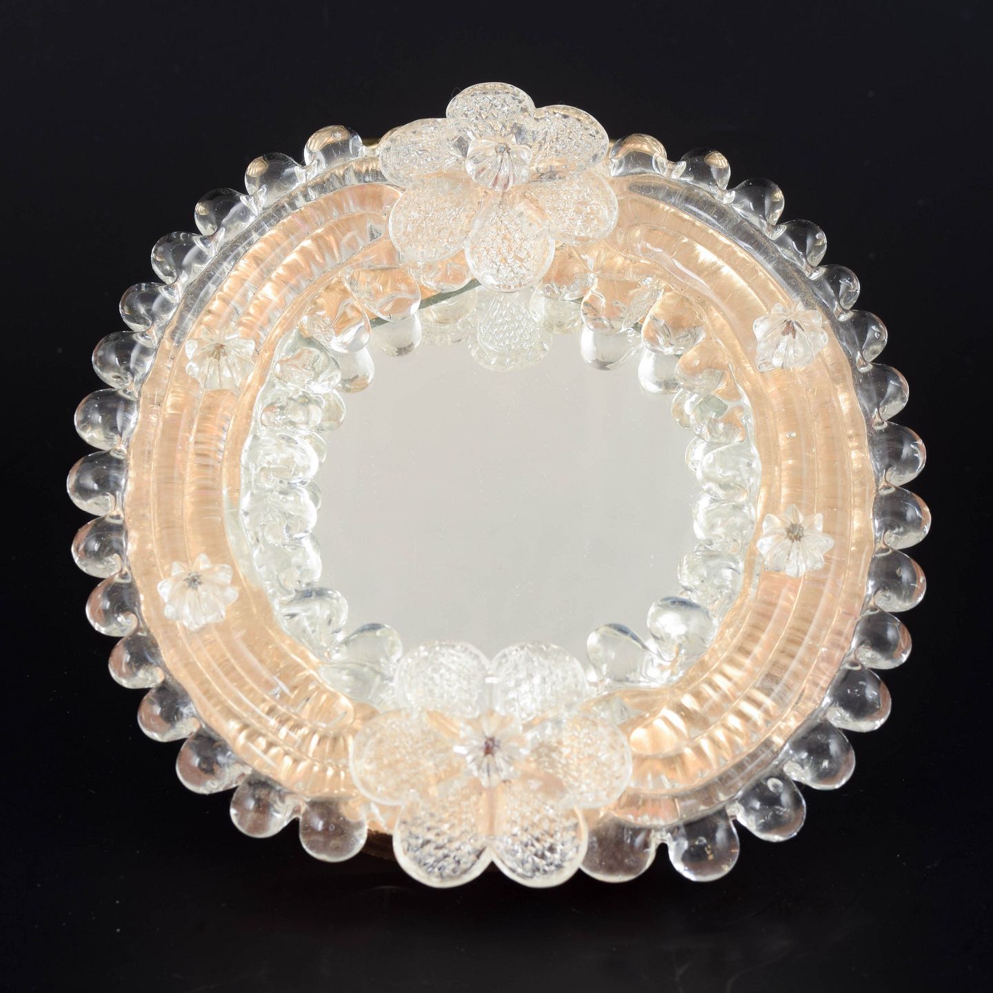Murano, spejl.Lille dekorativt vægspejl med ramme af håndformet Murano-glas i varme rosétoner og klart glas. Rammen er opbygget af påsatte blomster- og knopformer med rillet og boblet struktur, typisk for venetiansk glasdesign fra midten af det 20. århundrede. Spejlglasset er indfældet centralt i den plastiske glasramme.
