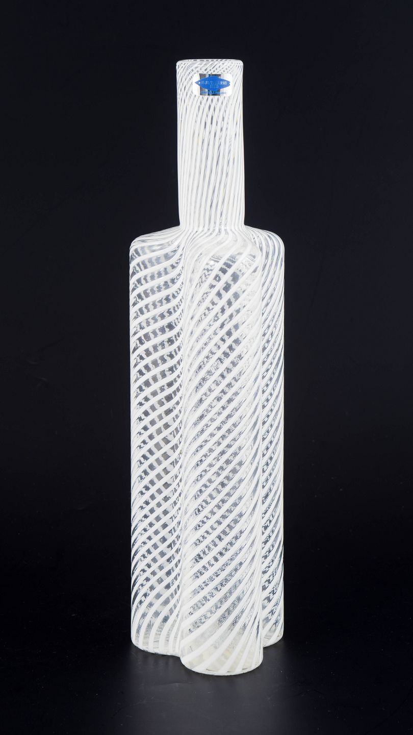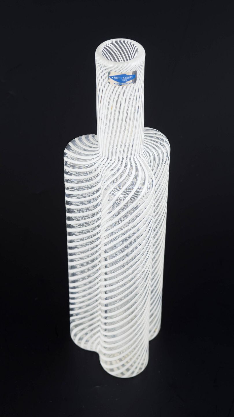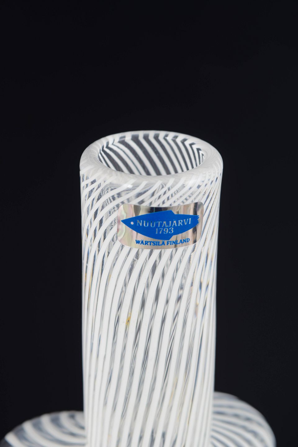 Heikki Orvola for Nuutajärvi, vase.Slank flaskeformet vase i klart kunstglas med indlagt hvid spiral- og trådmønster udført i lagdelt teknik. Modellen er mundblæst og fremstår med original Nuutajärvi 1793 Wärtsilä Finland-klistermærke samt signering. Formen og den optiske dekoration er karakteristisk for finsk kunstglas fra 1970’erne.