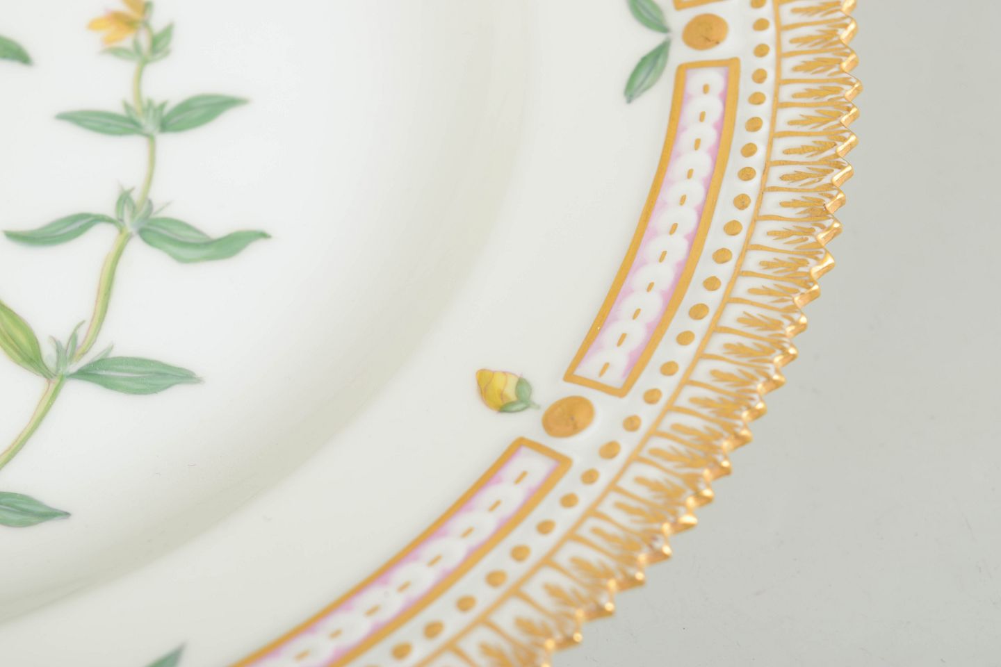 Royal Copenhagen, Flora Danica middagstallerken.Middagstallerken i porcelæn med håndmalet botanisk motiv fra det eksklusive Flora Danica-stel, udført i naturalistiske farver og indrammet af rigt forgyldt bort.