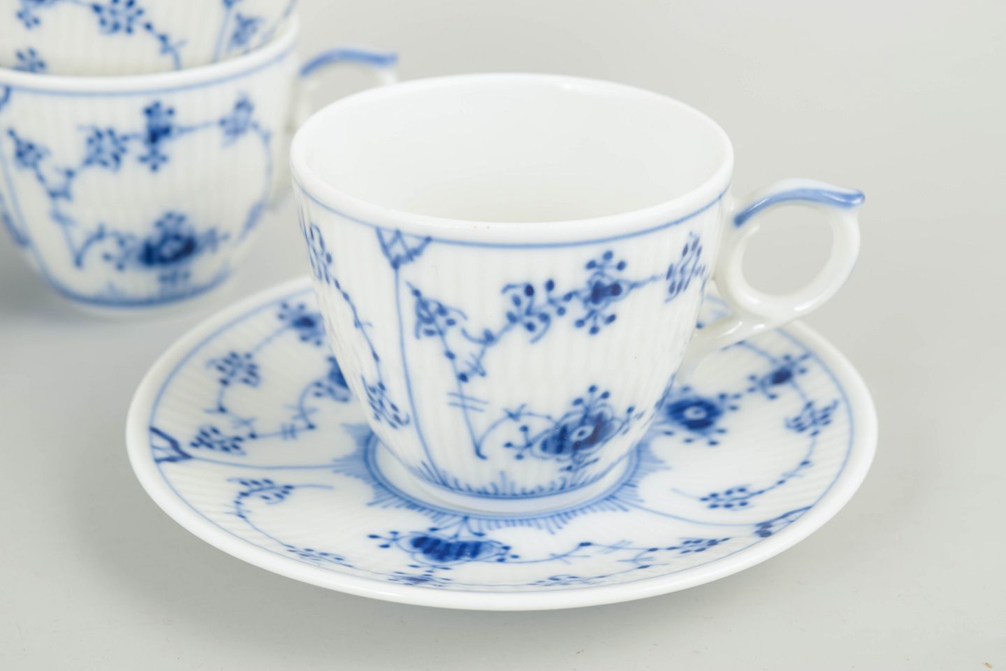 Royal Copenhagen, Musselmalet riflet kaffekopper med tilhørende underkopper, sæt af 4.Sæt bestående af fire kaffekopper med tilhørende underkopper i glaseret porcelæn, dekoreret med håndmalet underglasur i det klassiske musselmalede mønster. Model 1/298.
