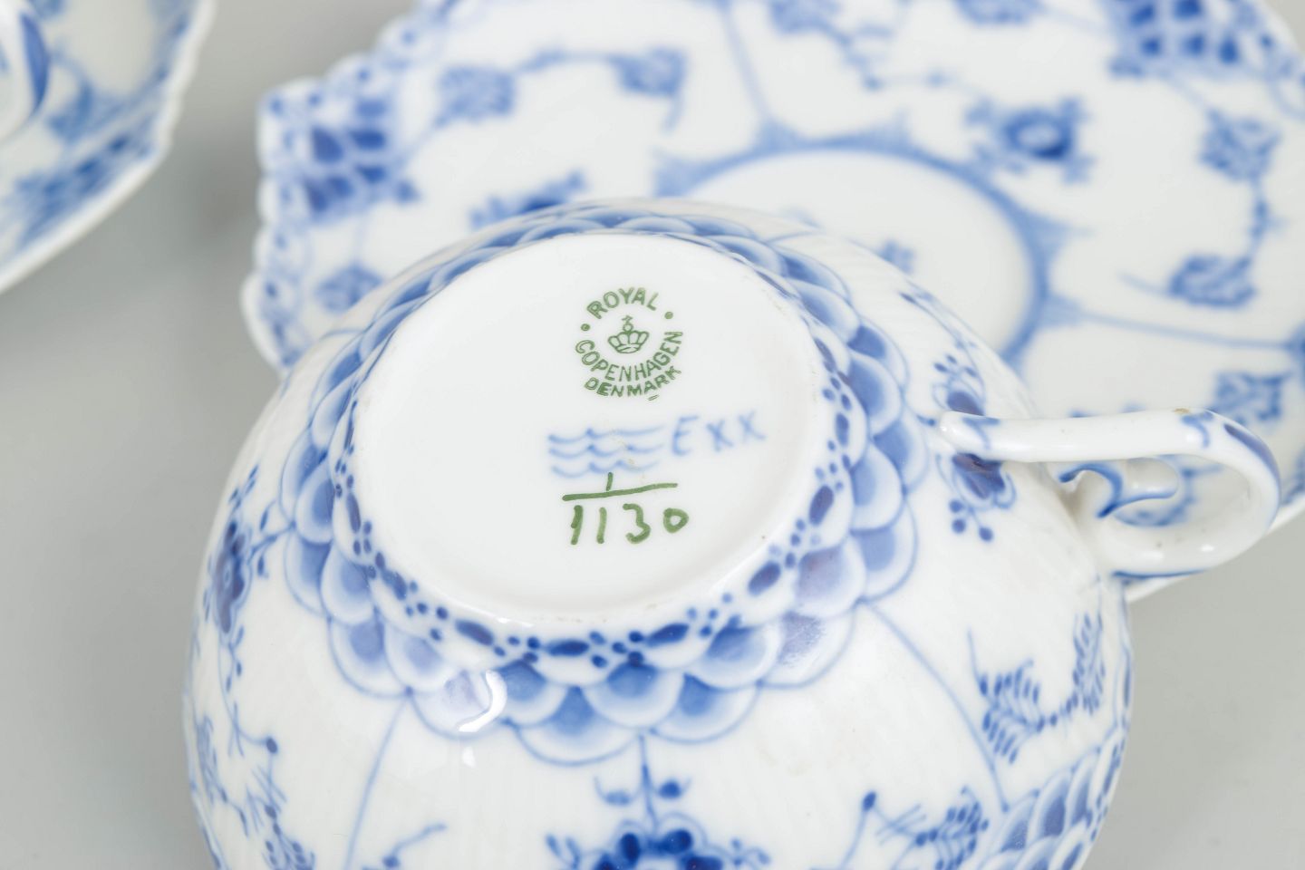 Royal Copenhagen, Musselmalet helblonde tekopper med underkopper, sæt på 2.To tekopper med matchende underkopper i håndmalet underglasurblå dekoration i Musselmalet helblonde, med gennembrudt blondedekoration langs kant. Kop og underkop model 1/1130. Annulleret med én og to indridsede streger.