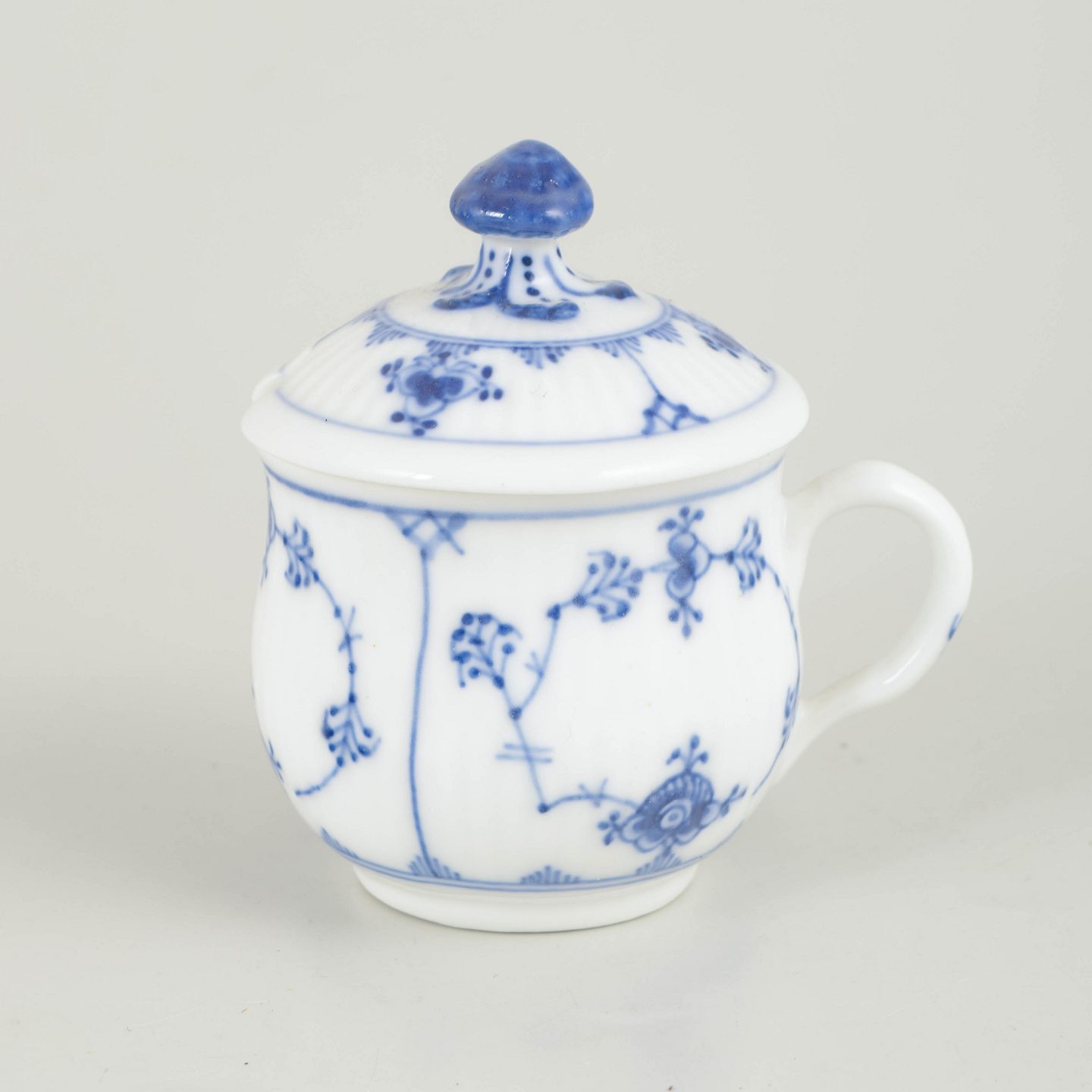 Musselmalet riflet er Royal Copenhagens ældste stel, introduceret i 1775. Dekorationen udføres i frihåndsmalet kobolt under glasuren, hvilket giver levende variationer i streg og farve. Cremekopper med låg var en fast del af det klassiske bord i slutningen af 1800-tallet og begyndelsen af 1900-tallet og afspejler tidens formelle serveringskultur og høje porcelænshåndværk.