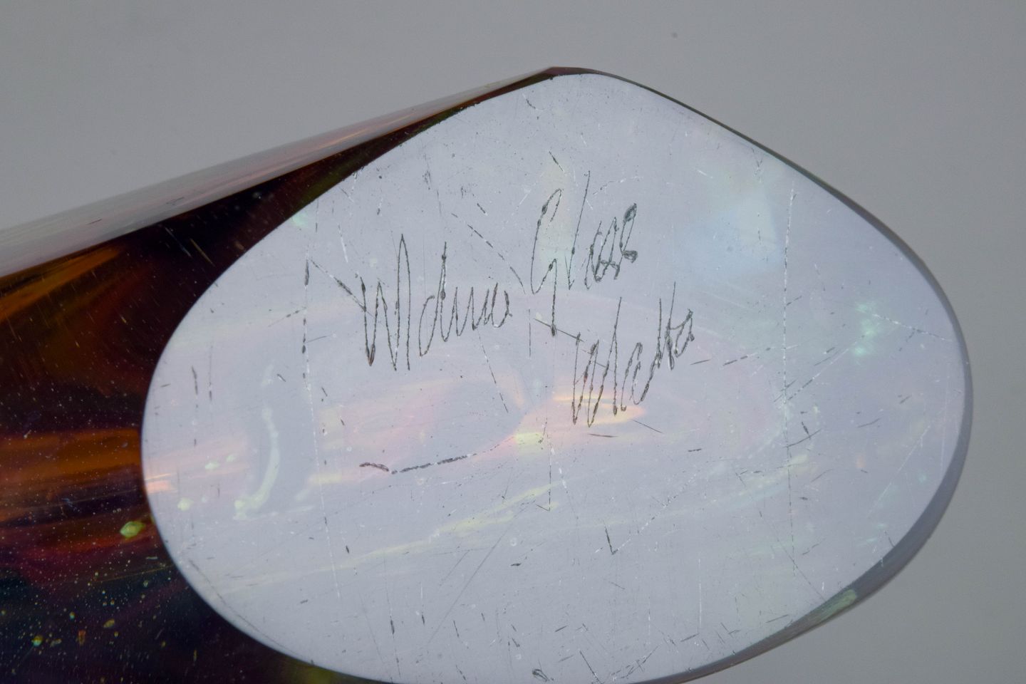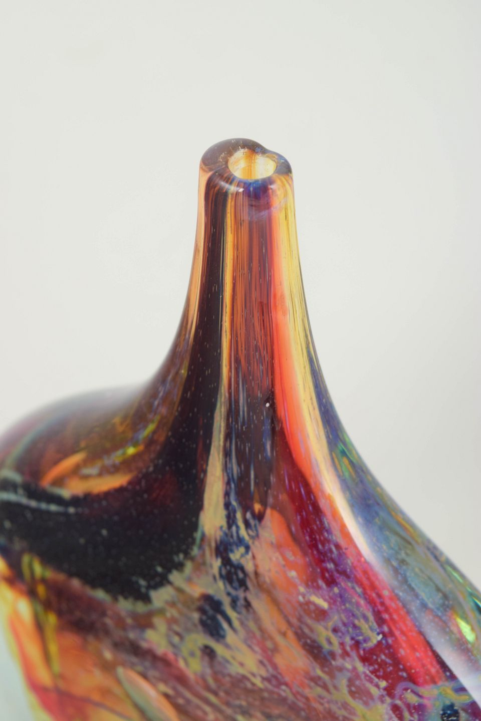 Mdina Glass, kunstglasvase.Organisk formet kunstglasvase i kraftigt, mundblæst glas med indkapslede, hvirvlende farver i rav, orange og mørke kontraster, afsluttet med klart ydre lag. Frit opbygget, asymmetrisk form med markant tyngde i bunden. Signeret under bunden Mdina glass, Malta”.
