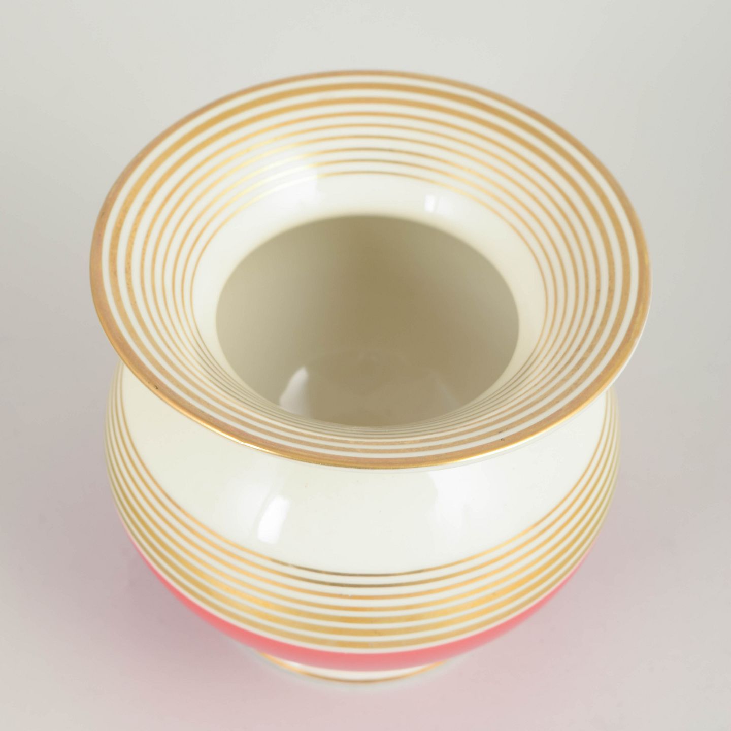 Johann Seltmann Vohenstrauss, art deco vase.Art deco–formet porcelænsvase med balusterkrop, flad fod og udadbøjet munding. Dekoreret med brede horisontale bånd i rød og elfenbenshvid med forgyldte linjer. Underglasur fabriksstempel “Johann Seltmann Vohenstrauss Bavaria” under bunden.
