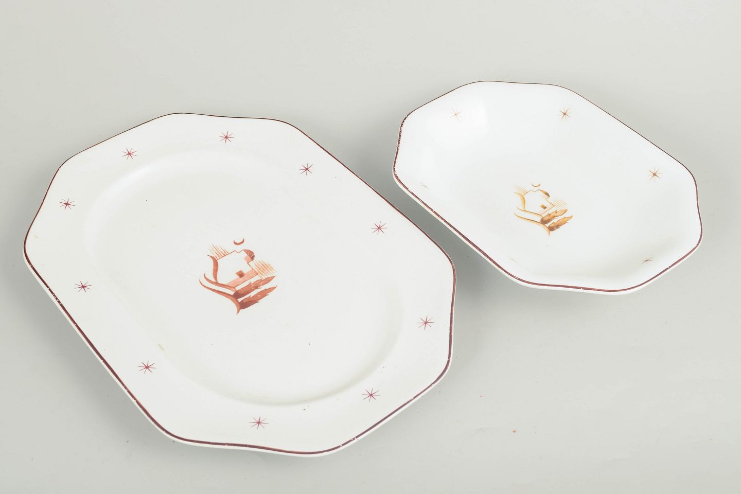 Arabia, Orient, to fade.Fade i glaseret fajance med bølget form, brun kantstreg og stjernemotiver samt centralt orientalsk landskabsmotiv. Model Orient. To størrelser.