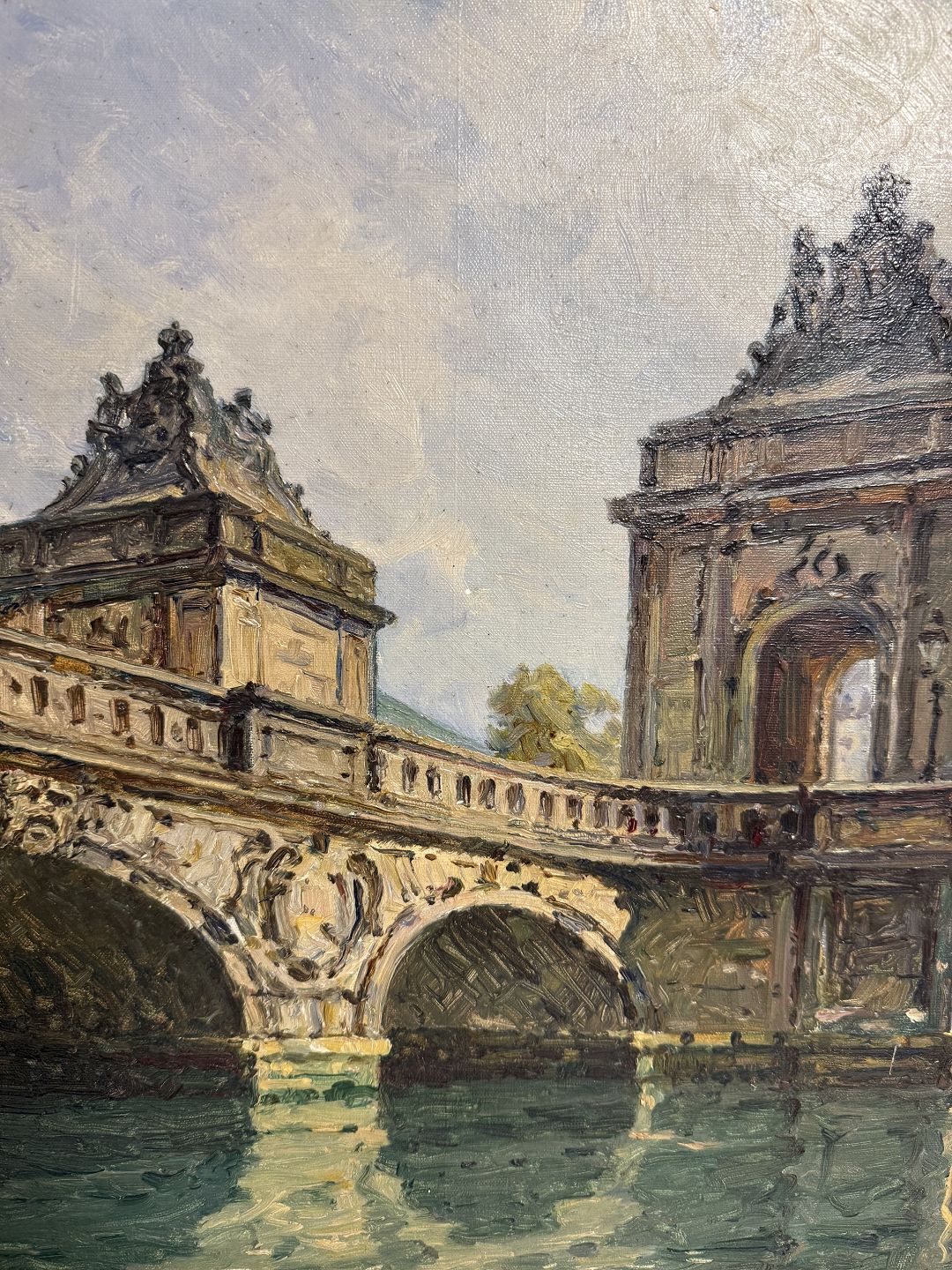 Peter Elias Petersen (1859-1950), Marmorbroen ved Christiansborg i København med godt lys over bro og vand, Signeret P.E.P. og bag på påskrevet P. E. Peteresen 1922, Mål med ramme: 46,5x44,5cm *Fin stand*Lager: 1