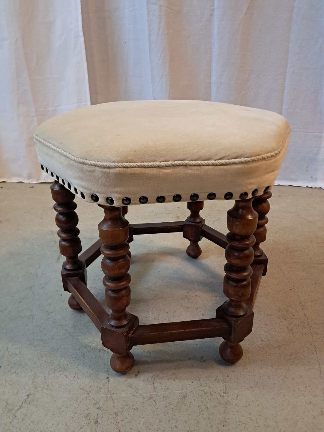Skammel i massivt egetræ, fra 1950erne.Den har brugsspor.