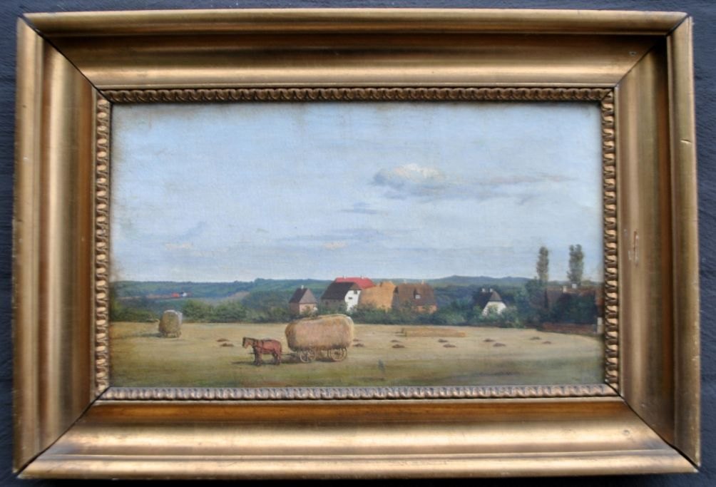 Rademacher, Niels Grønbek (1812 - 1885) Danmark: Høstscene fra en sjællandsk herregård. Olie på lærred. Svagt signeret. 19 x 32,5 cm.Indrammet: 29 x 42 cm.