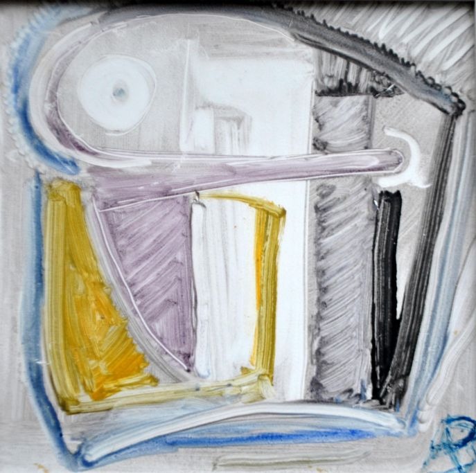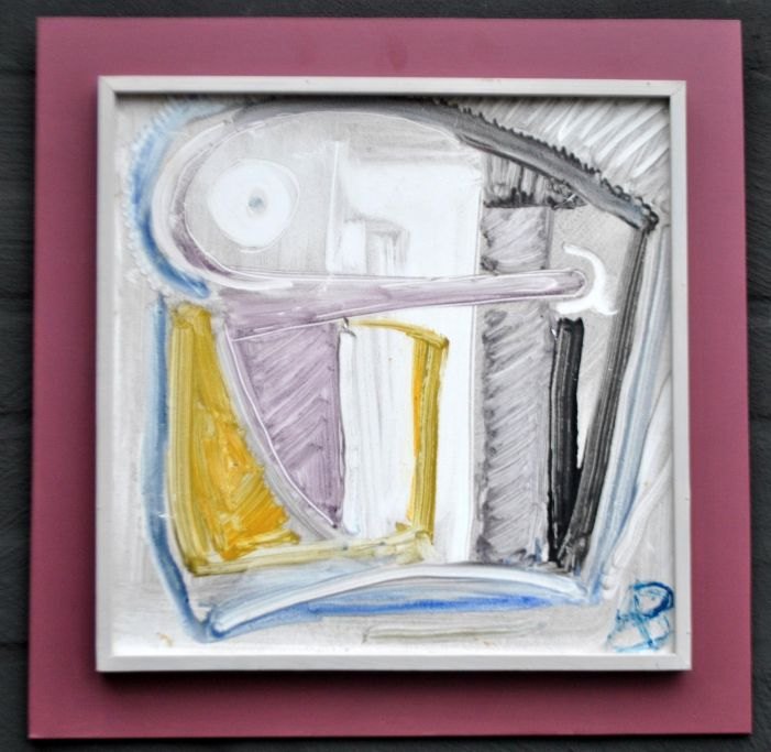 Brügger, Ane (1908 - 1995) Danmark: Komposition. Keramik flise bemalet i gult, lilla, blåt og grå nuancer. Signeret: AB. H: 32,5 cm. B: 32,5 cm.Indrammet: 42,5 cm. B: 42,5 cm.