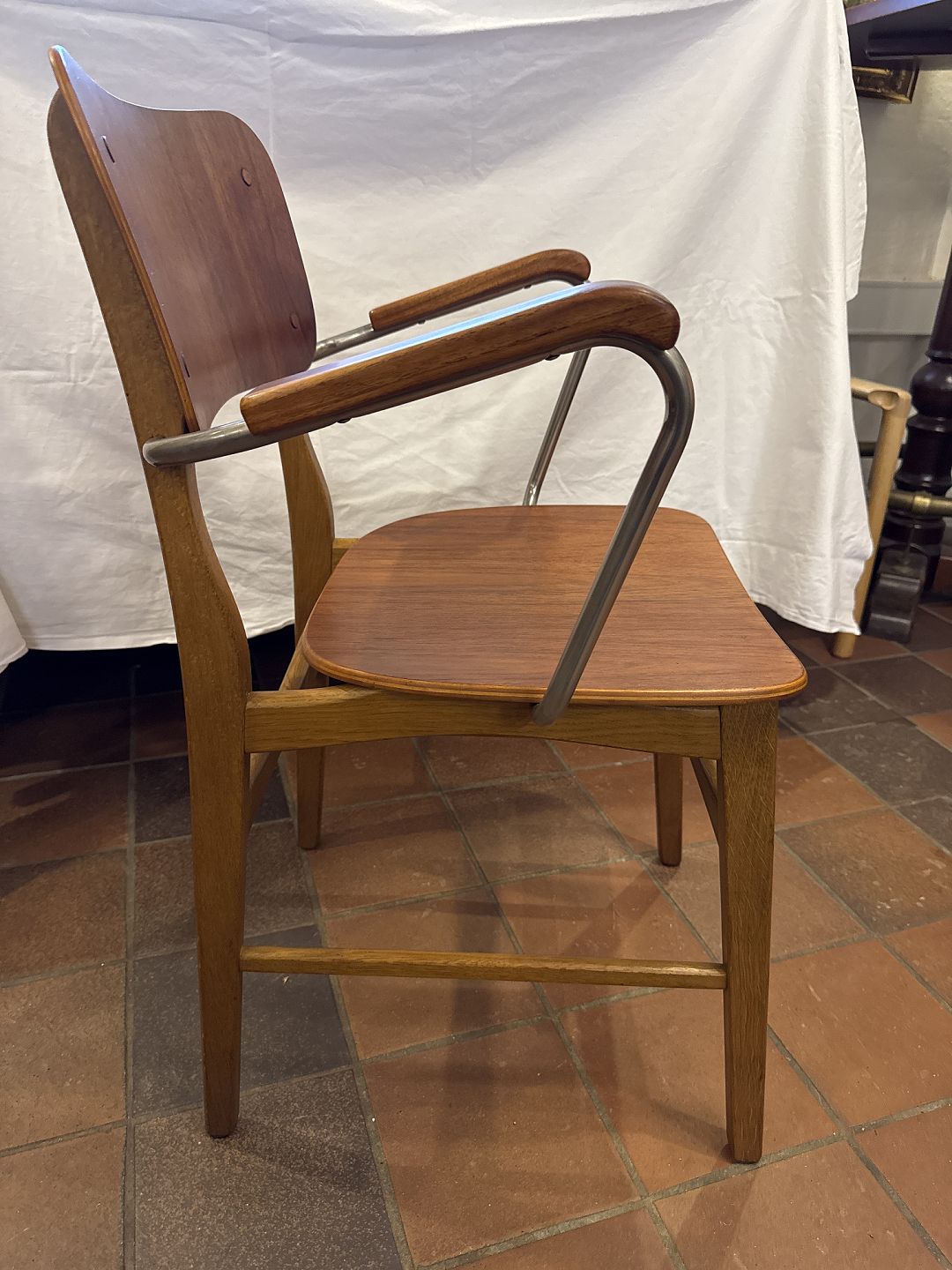Ib Kofod Larsen armstol med stel i eg samt sæde og ryg i teak og metal. Fremstillet ca. 1960’ernePæn brugt stand.